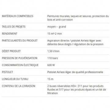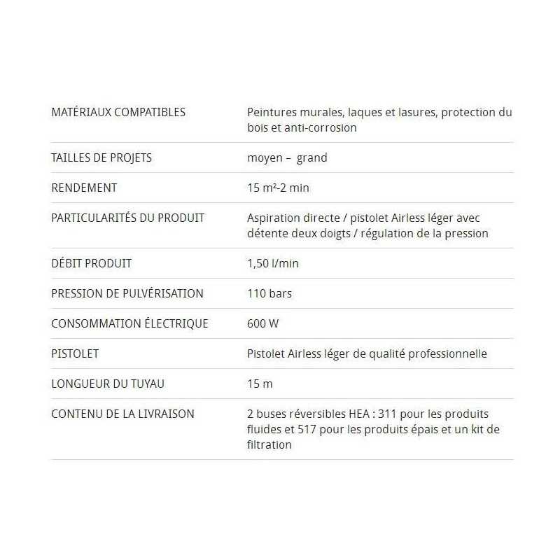 Pompe Airless a piston pour de moyens a tres grands projets - Dotée de la technologie innovante High Efficiency Airless - Equipée d'une buse produits fluides Pro 311, buse peintures murales Pro 517, HEA kit filtre, pistolet hybride - Débit de produit 1,5 l/min - Pression : 110 bar - Puissance : 600 W - Longueur de tuyau : 15 m.