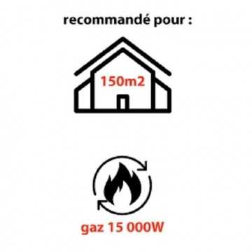 Chauffage a gaz avec turbine incorporée (branchement sur 230V obligatoire) - Turbine de propulsion 230V incorporée - Puissance de chauffe : 15 000 W - Allumage piezo - Compatible avec bouteille de gaz Propane (Butane possible sur courte durée) - Sécurité coupure automatique fuite de gaz - Tuyau 1,5m et détendeur 700mbar CE (compatible bouteille 13kg) fournis - Entrée gaz raccord 1/4 (12x17 mâle).