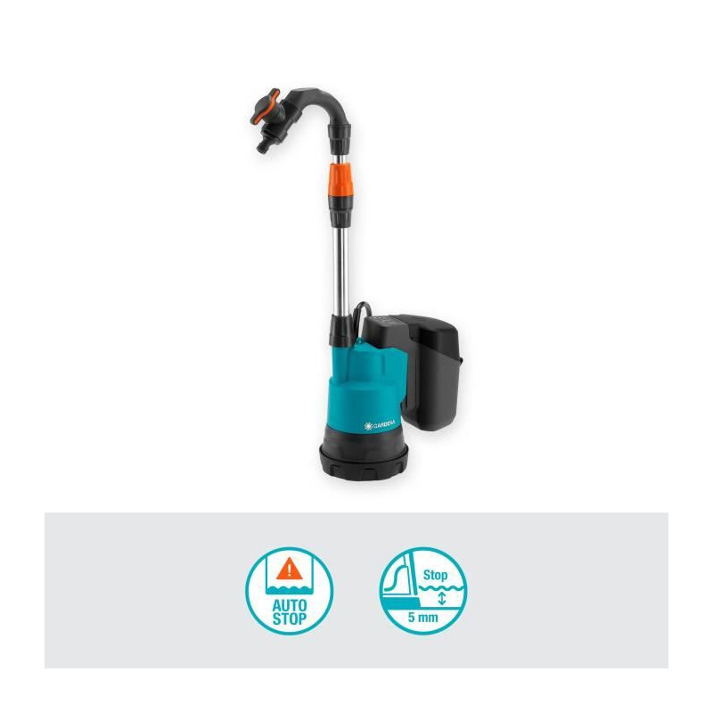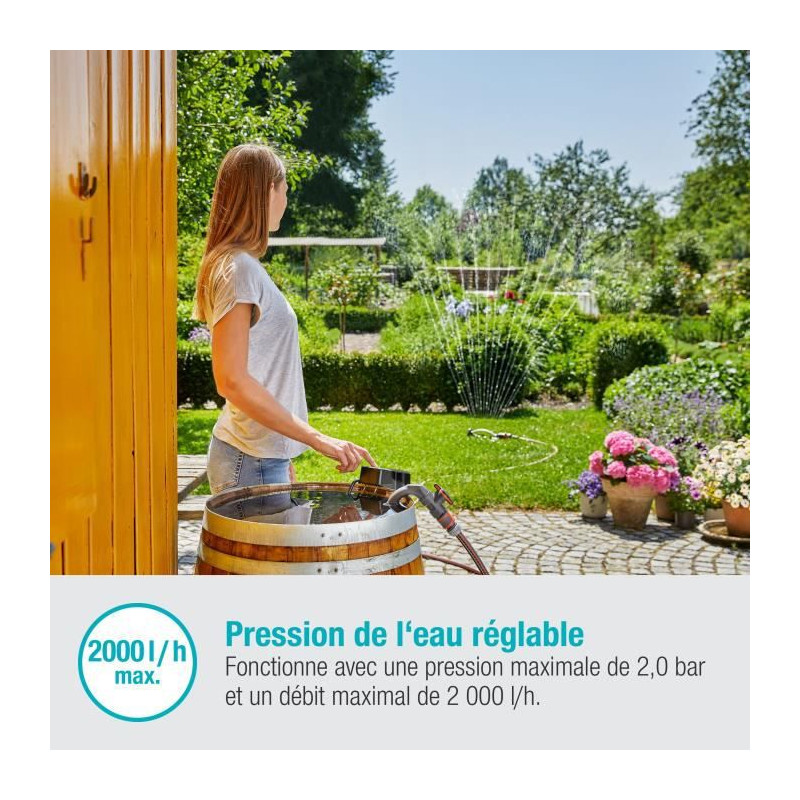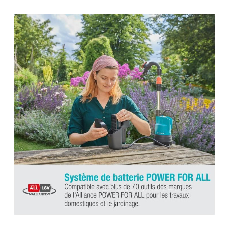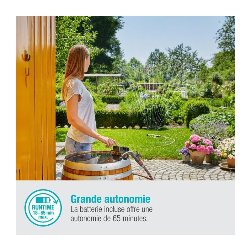 Pompe pour collecteur d'eau de pluie 2000/2 18V P4A - Livrée avec batterie Li-ion 18V 2,5Ah PBA 18V/45 et chargeur standard AL 1810 CV - Débit max - 2000 l/h - 2,0 bar - Tube de refoulement télescopique coudé en aluminium pour suspendre la pompe - 3 modes