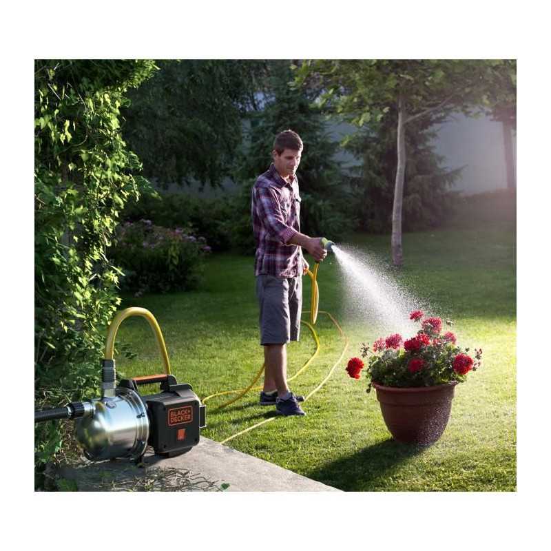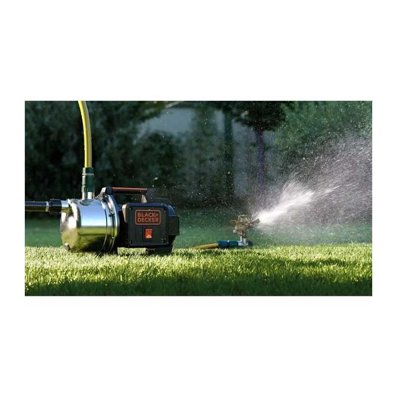 Pompe d'arrosage de jardin amorçage automatique 1100 W a jet d'eau Tete et poignée de pompe en acier inoxydable, boîtier du moteur en aluminium, carter ventilateur en métal Adaptée a l'arrosage, la distribution de l'eau dans les installations de lavage et le remplissage/vidage de réservoirs ou de citernes Moteur: INDUCTION Puissance : 1100 W - 220-230v / 50 Hz Vitesse : 2800 tr/min Débit : 4600 L/h Pression: