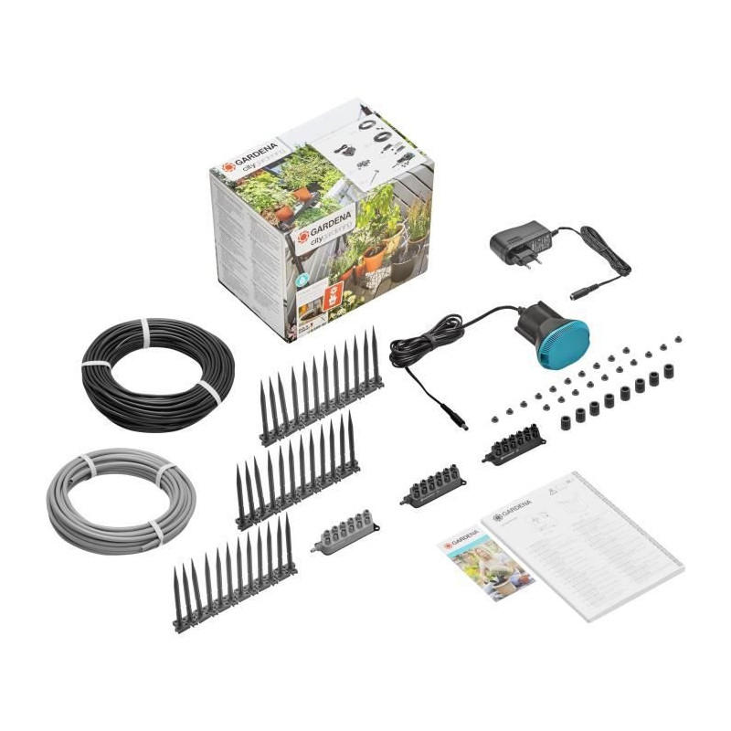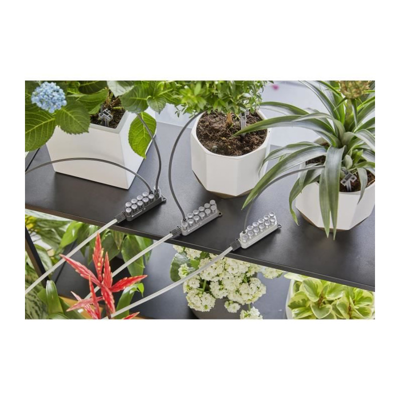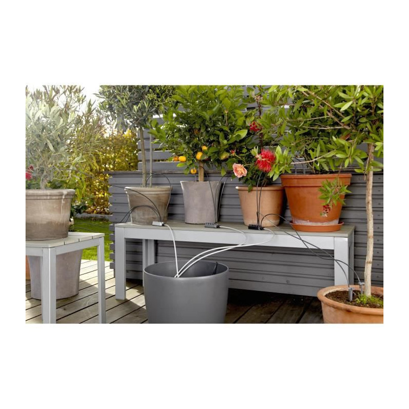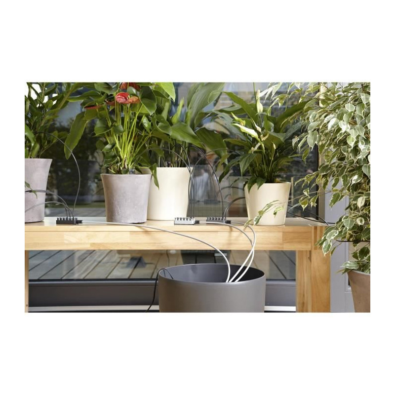 Pour arroser jusqu'a 36 plantes en pot - Transformateur avec minuterie incorporée : déclenche tous les jours 1 minute d'arrosage - Se branche sur une prise 220/230V a l'intérieur ou a l'extérieur - Pompe 14 Volts basse tension puissante et sûre avec filtre intégré, CE - Répartiteurs : 3 débits différents pour adapter le volume d'eau aux besoins des plantes - Pics pour maintenir jusqu'a 3 tuyaux par pot