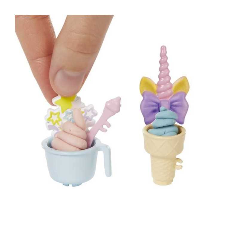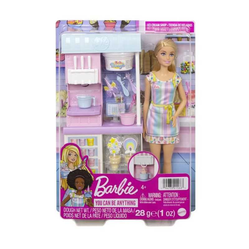 Grâce a de la pâte a modeler et aux accessoires de jeu, Barbie réalise de belles glaces colorées a emporter. La poupée est incluse avec les accessoires.