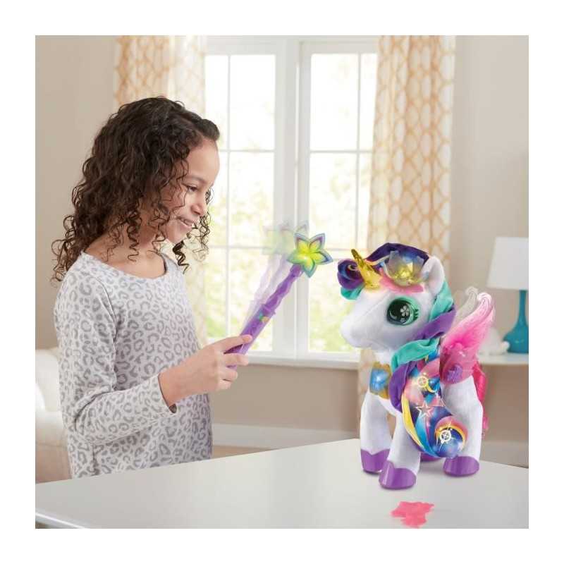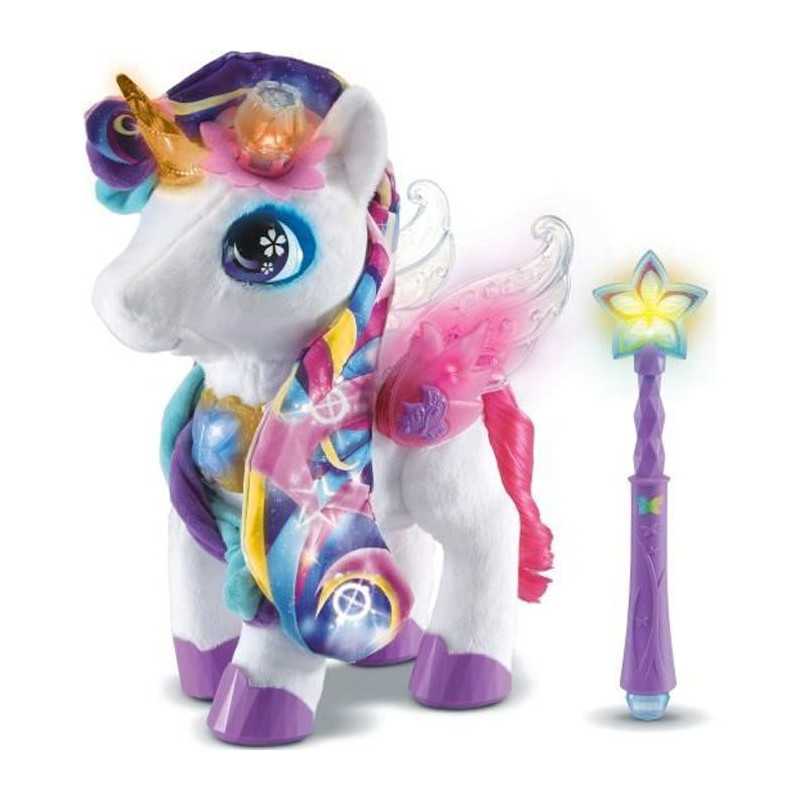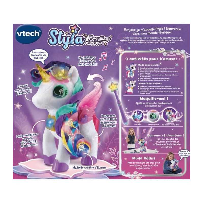 Styla est une licorne interactive en peluche toute douce a maquiller. L'enfant choisit une couleur grâce a la baguette magique et l'applique sur la corne, les paupieres, les ailes et la fleur magique ! Génial ! Une fois la couleur appliquée, Styla bat des ailes comme pour s'envoler !