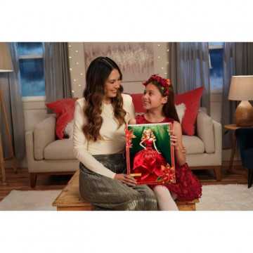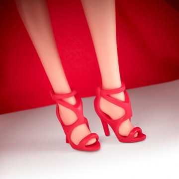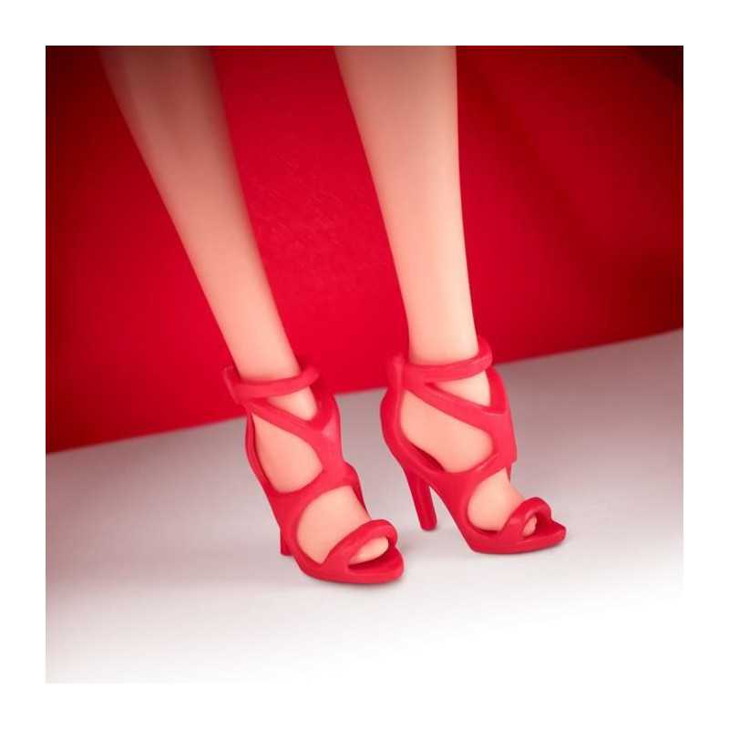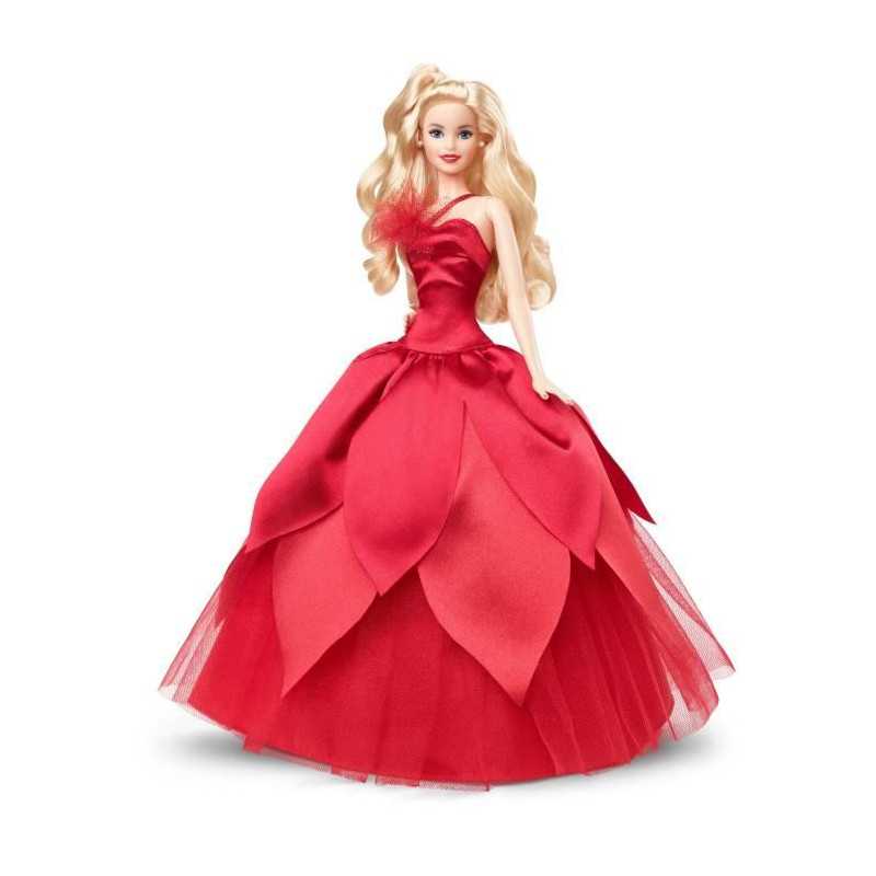 Barbie célebre la nativité dans un éclat rouge vif. Cheveux bouclés et levres vermeilles, elle porte une robe évasée avec volants de tulle et de satin. - pas de piles - 6 ans et +