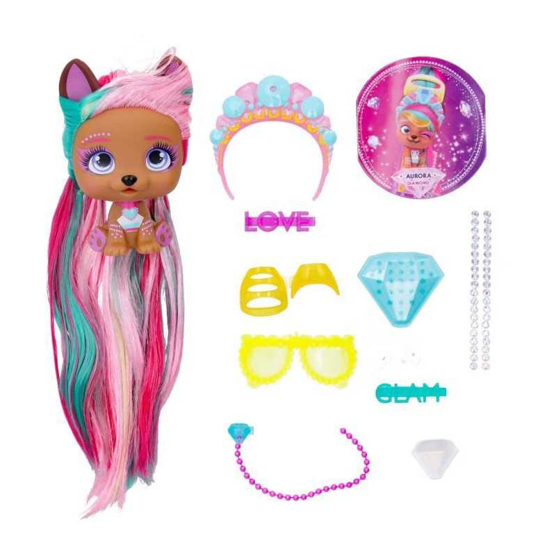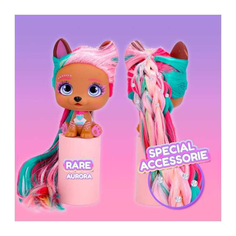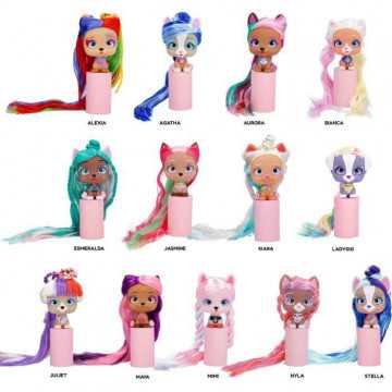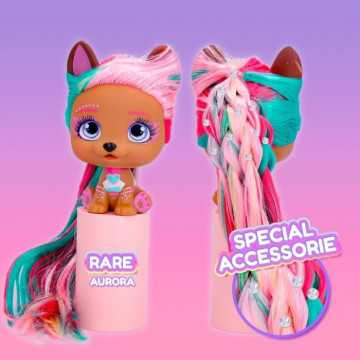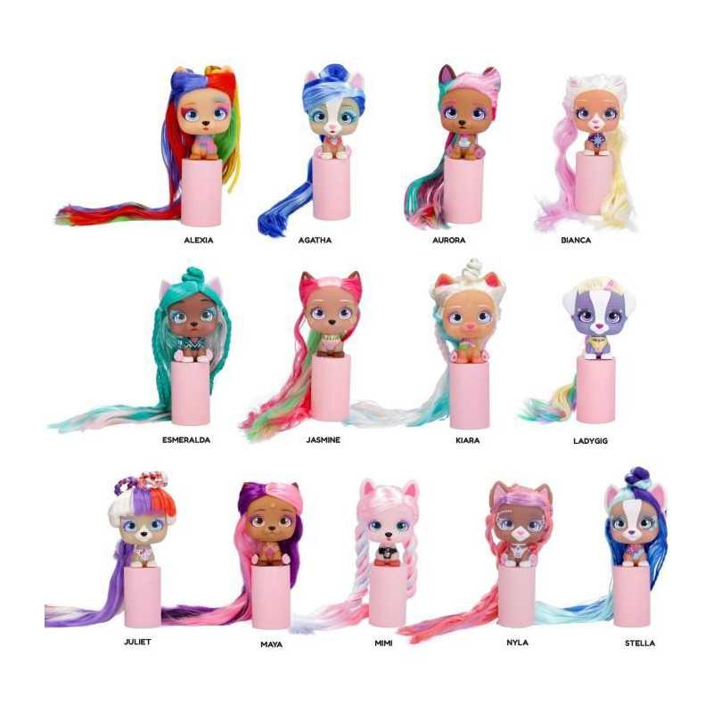 Mini poupées VIP Pets aux cheveux extra longs de 30 cm a découvrir. Une capsule magique thermosensible qui dévoile ton VIP Pets. 12 poupées + 1 rare a collectionner. Inclus : 1 poupée et 6 accessoires