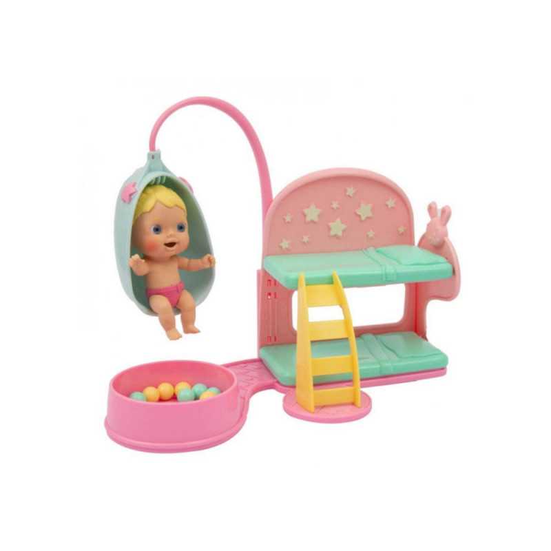 Découvre vite la chambre de tes Cicciobello Amicicci! L'endroit parfait pour faire passer une bonne nuit, bercé par les étoiles lumineuses... Tu peux aussi te détendre sur le fauteuil a bascule ou jouer dans la piscine a balles. Contient: 1 Cicciobello Amicicci 1 Lit superposé Des accessoires Autocollants pour décorer