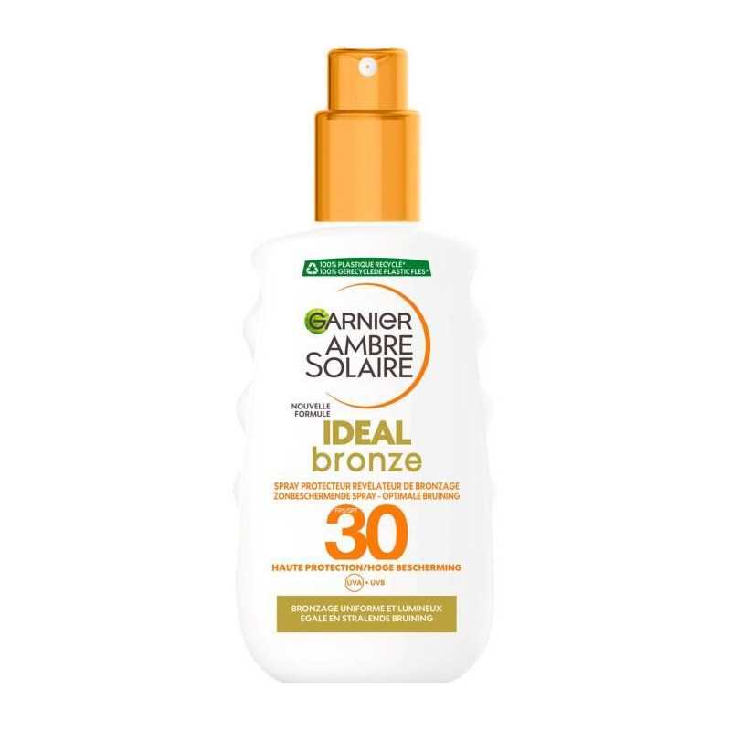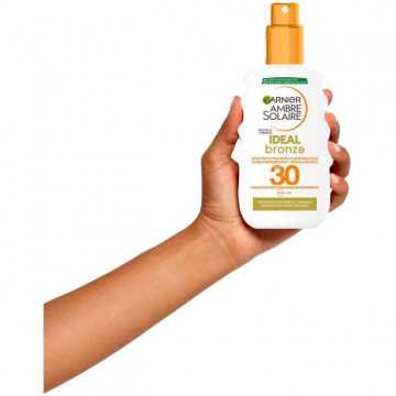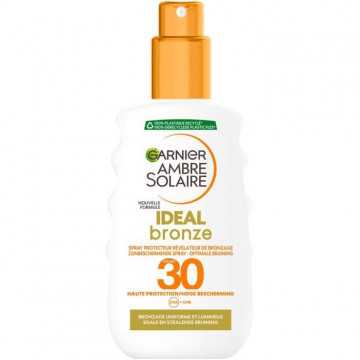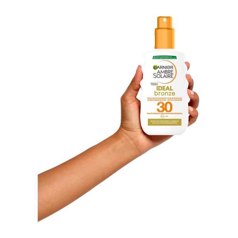 Le Spray Ideal Bronze, de Garnier Ambre Solaire, vous protege contre les UVA, UVB tout en apportant un bronzage optimal, lumineux et uniforme.
