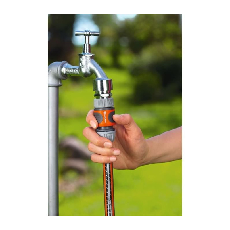 - Raccord rapide avec connexion/déconnexion en 1 clic,a fixer sur le nez du robinet, adapté a tous les tuyaux de diametre 13mm et 15mm - Technologie Power Grip avec bague de serrage qui permet d'assurer une connexion solide entre le tuyau et le robinet - Connexion Original GARDENA System®,raccord adapté a tous les tuyaux et accessoires GARDENA compatibles - Produit haute qualité, fabriqué en Allemagne, garanti 5