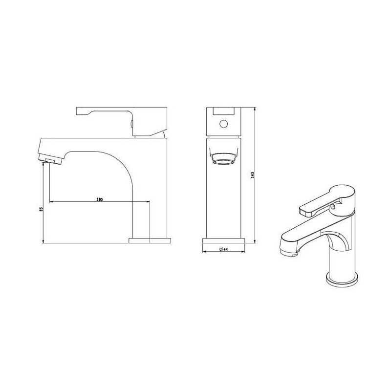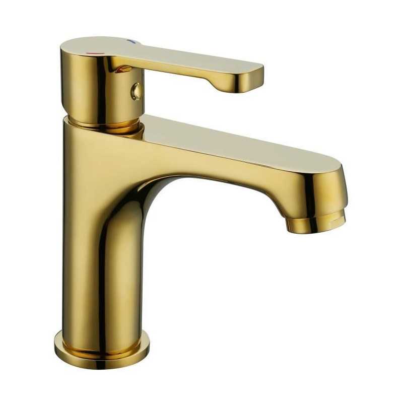 Mitigeur lavabo - Cartouche céramique Ø25 mm - Aérateur réducteur de débit - Poignée : métal - Corps en laiton - Bec : fixe - Revetement : PVD couleur doré - Embase : 44 mm - Vidage : clic clac laiton/zamak - Flexibles de raccordement : inox F 3/8 - Hauteur totale : 14,3 cm - Hauteur sous bec : 8,5 cm - Saillie : 10,5 cm.