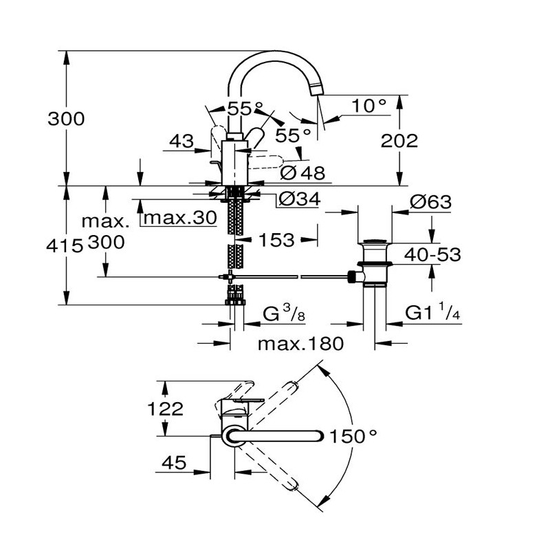 Caractéristiques techniques : Mitigeur de lavabo monocommande et monotrou Levier de commande métallique Fixation de poignée invisible GROHE SilkMove : cartouche en céramique 35 mm Limiteur de débit ajustable GROHE StarLight Chrome éclatant et durable GROHE Zero conduit d'eau isolé sans plomb ni nickel GROHE FastFixation Bec tube pivotant avec mousseur Butée économique 1/2 débit Raccordement de vidage : 1 1/4''
