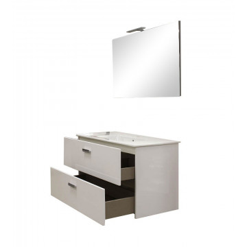 Avec une finition en blanc brillant, la vasque à poser se pose à droite sur le meuble à tiroir, sa fine épaisseur font de ce plan vasque un élément moderne pour la salle de bain. Très pratique, les deux tiroirs du meuble souvrent en effectuant une pression vers lintérieur du meuble et disposent de fermeture amortie. Le miroir avec son applique en Led offre un cadre très esthétique et habille magnifiquement lensemble vasque et meuble.