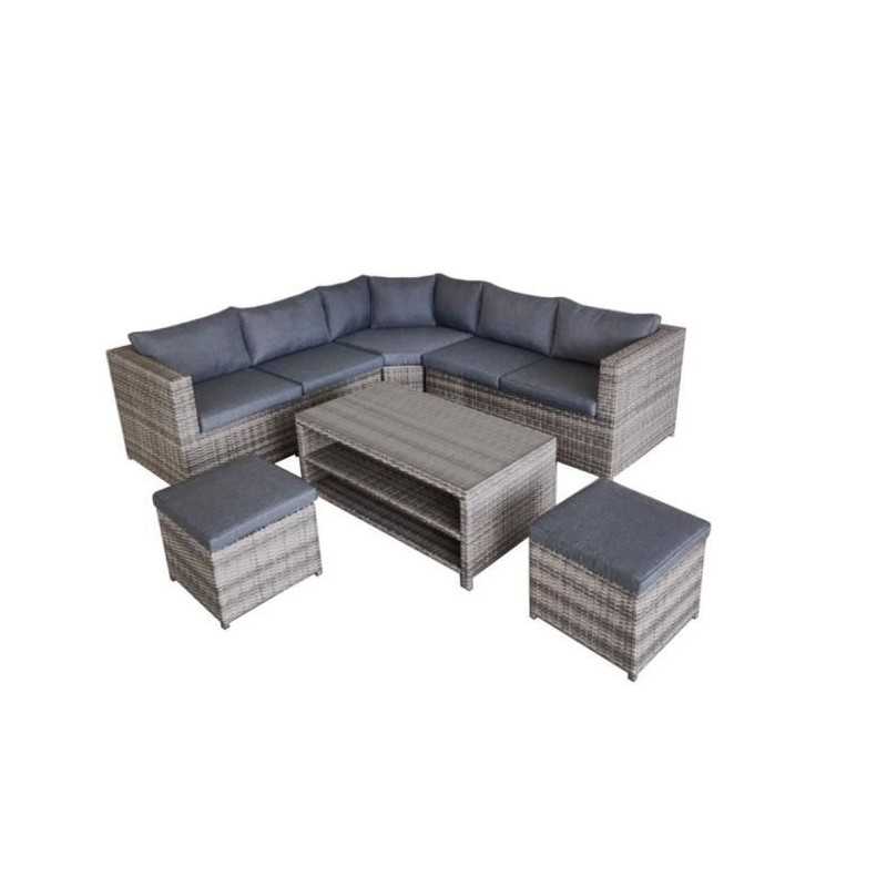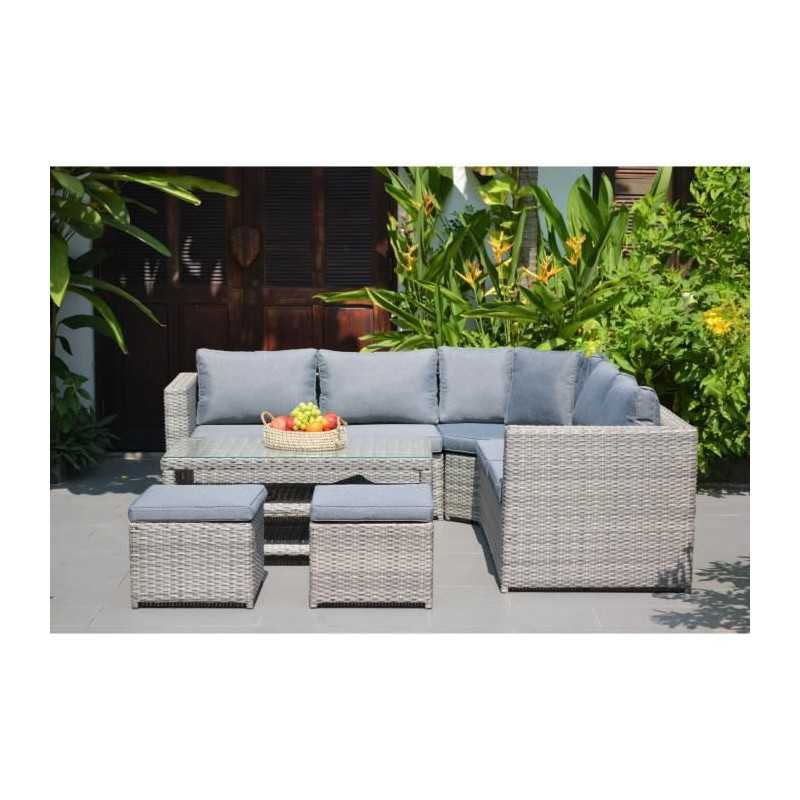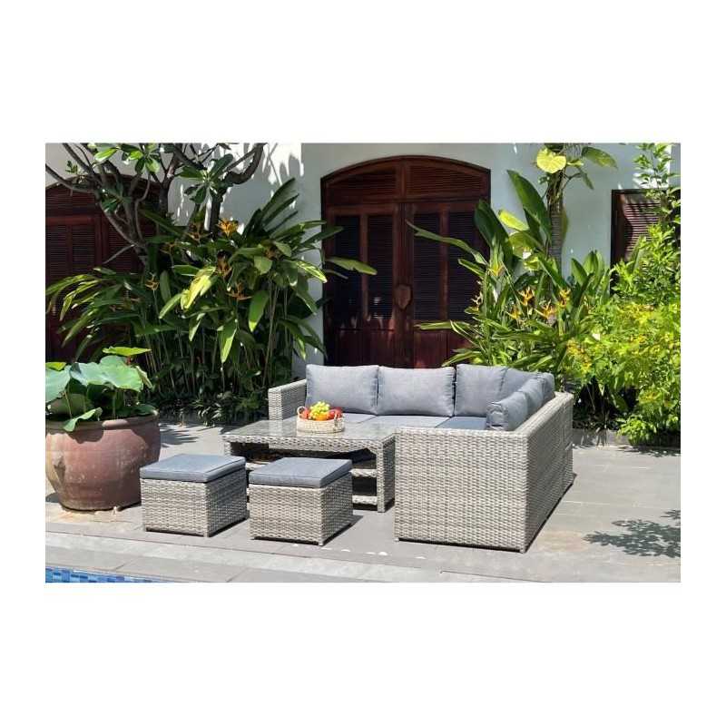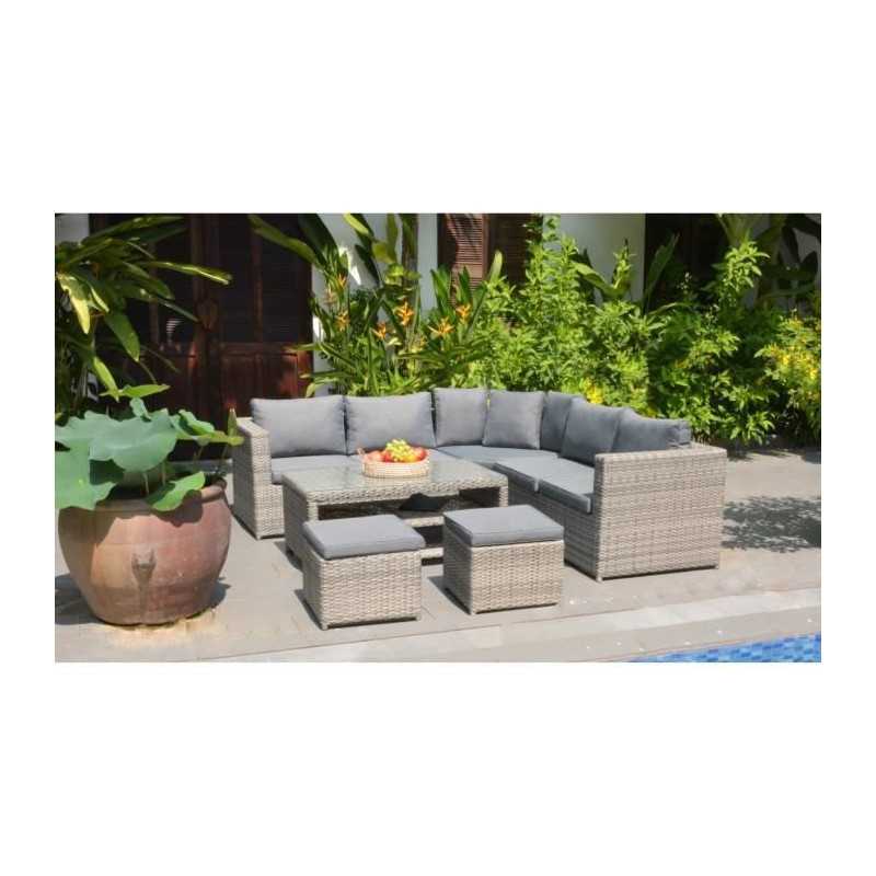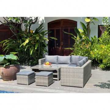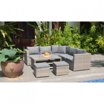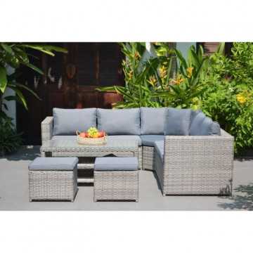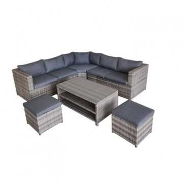 Cet agréable salon de jardin d'angle est en résine tressée et de couleur gris. Il se compose de deux banquettes 2 places, d'un angle et de deux poufs. Sa structure en acier et son revetement en résine tressée sont imperméables et facile a nettoyer. La table possede un plateau en verre trempé.
