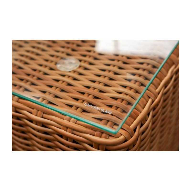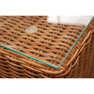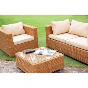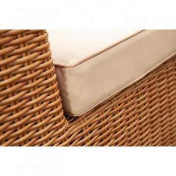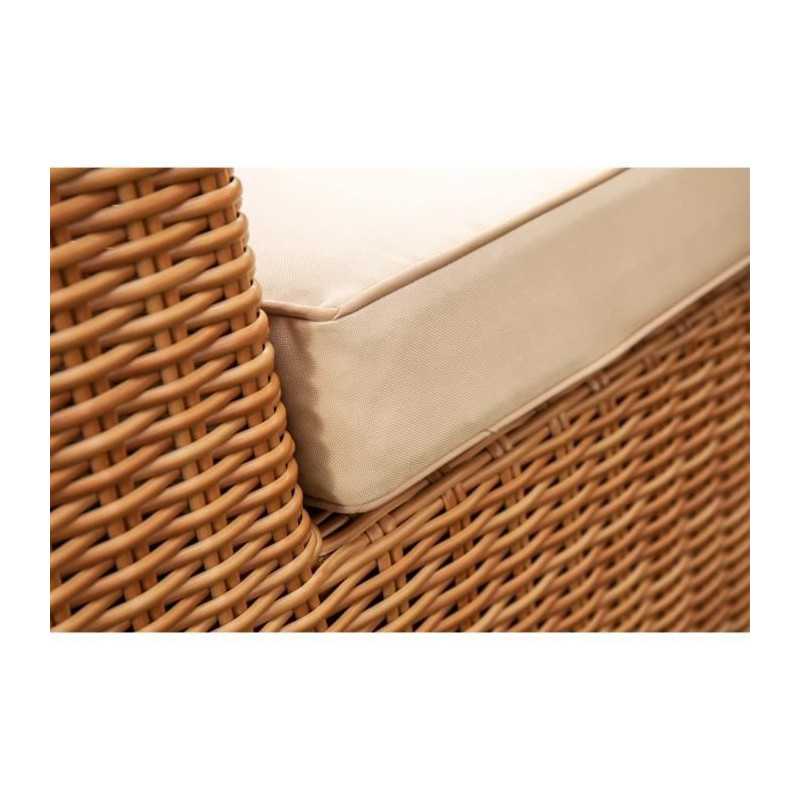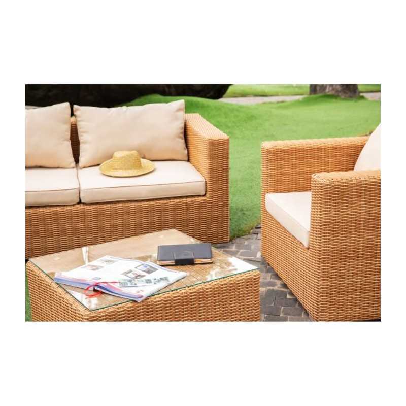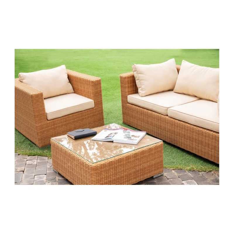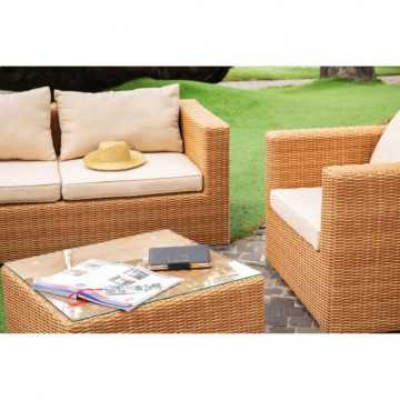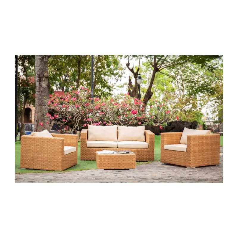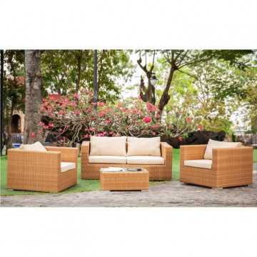 Cet agréable salon de jardin est fabriqué en résine tressée avec une structure en aluminium, et la couleur est celle de l'osier naturel. Il peut accueillir 4 personnes et se compose d'une banquette 2 places, de deux fauteuils et d'une table basse. Les coussins fournis vous offrent un grand confort.
