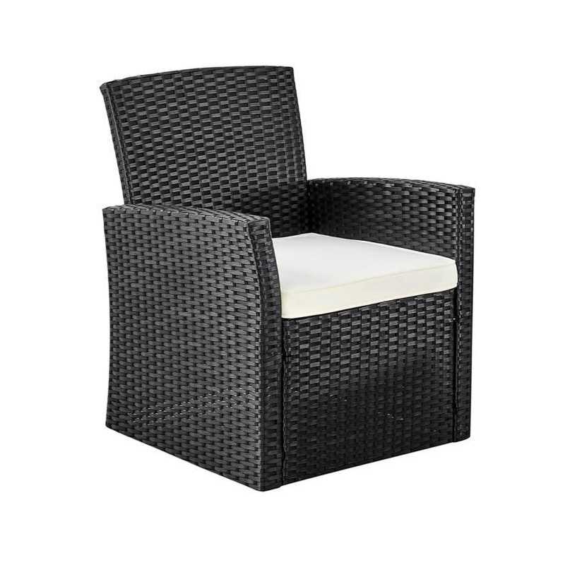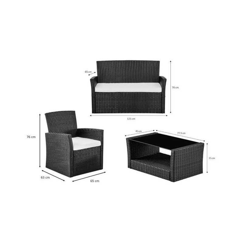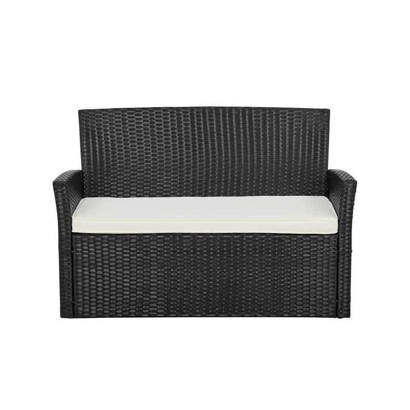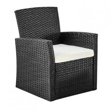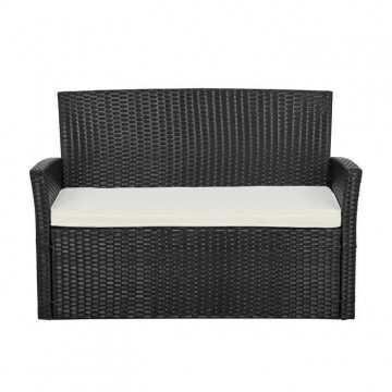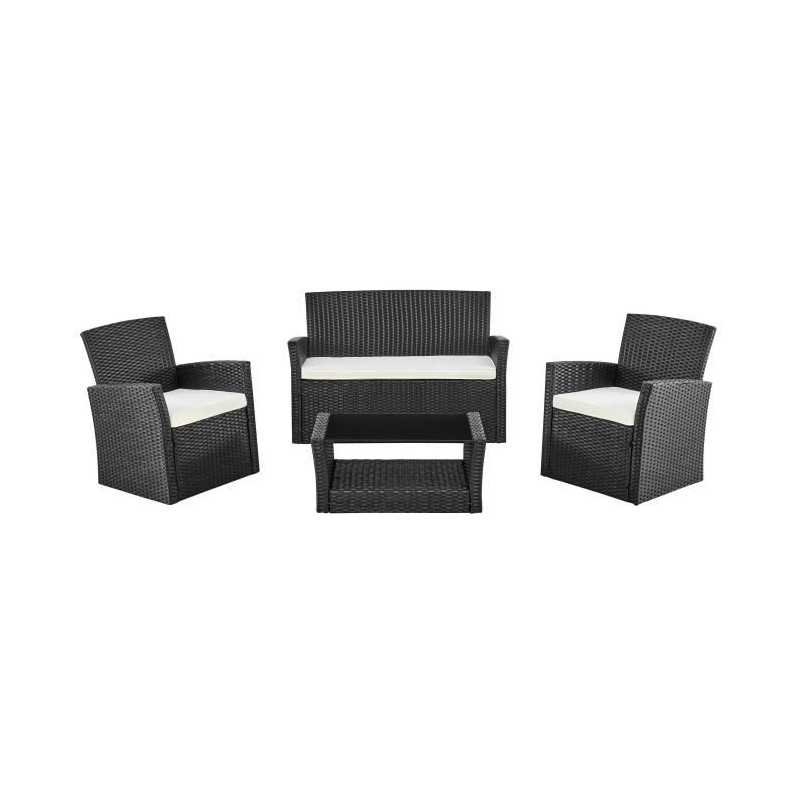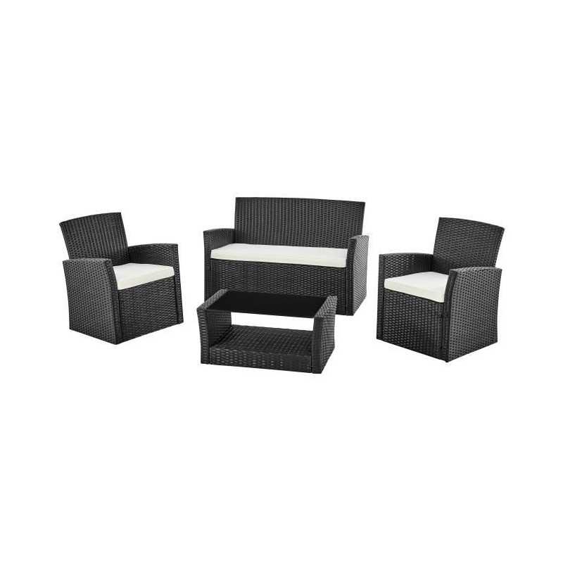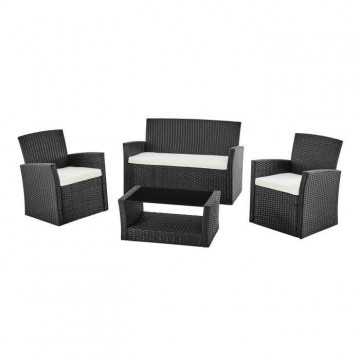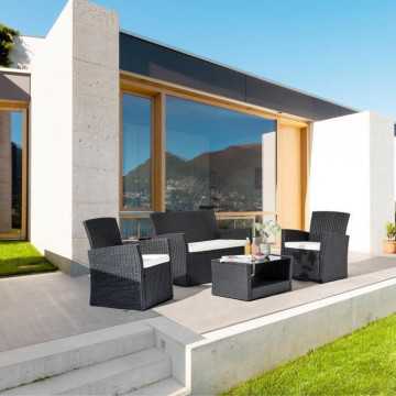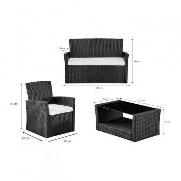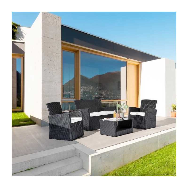 Cet agréable salon de jardin est fabriqué en résine tressée noire avec une structure en acier. Il se compose d'une banquette 2 places, de deux fauteuils et d'une table basse. La table basse possede un plateau en verre. Les coussins fournis assureront votre confort, ils sont en polyester 200gr/m2.