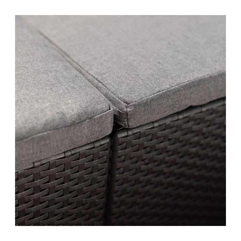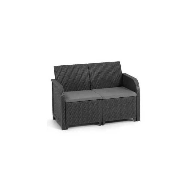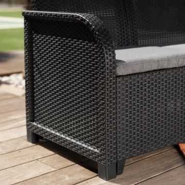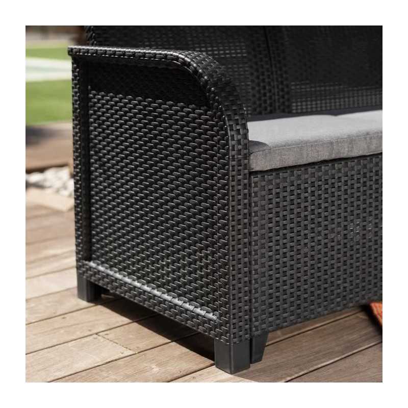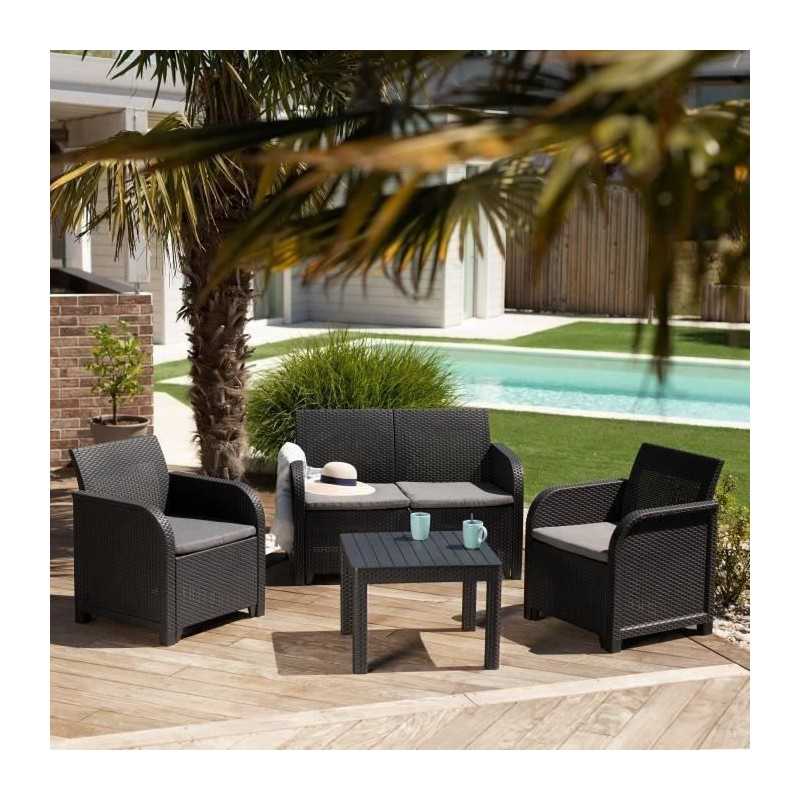 Cet agréable salon de jardin de couleur gris foncé, en résine injectée, se compose d'une agréable banquette 2 places, de deux fauteuils et d'une table basse. Ce produit est vendu avec des coussins et dispose de dossiers ergonomiques, ce qui le rendra confortable. Il est a monter soi-meme.