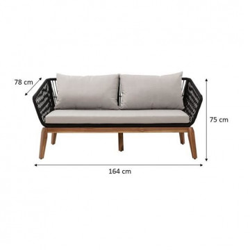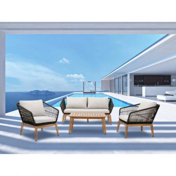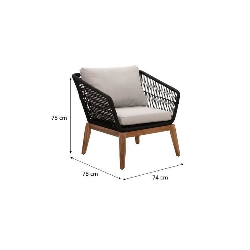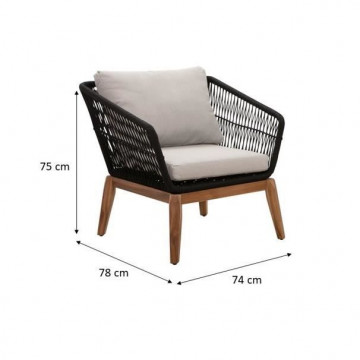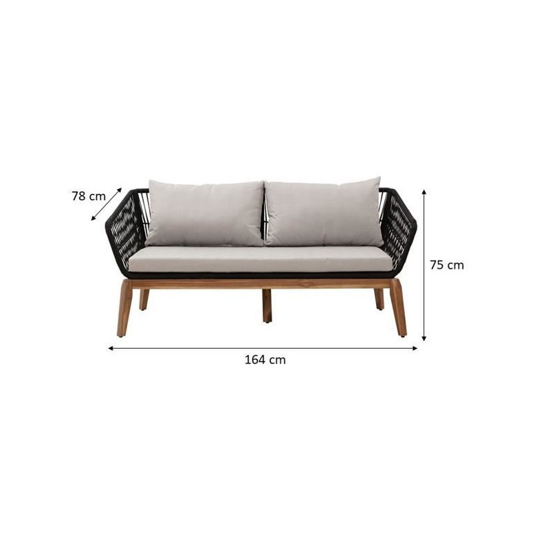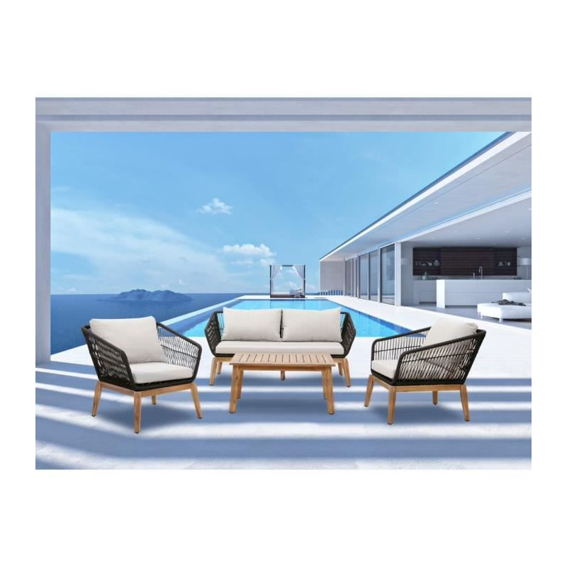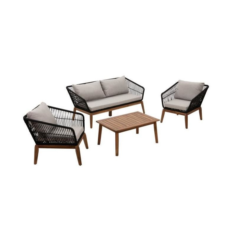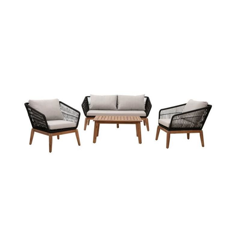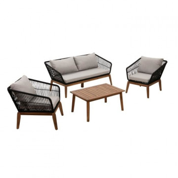 Cet agréable salon de jardin est fabriqué en bois d'Acacia FSC et en corde noire. Il peut accueillir jusqu'a 4 personnes et se compose d'une banquette deux places, de deux fauteuils et d'une table basse rectangulaire. Avec ses coussins fournis, il vous offrira un grand confort.