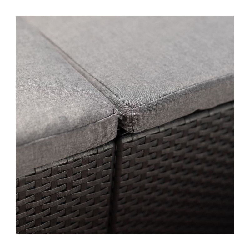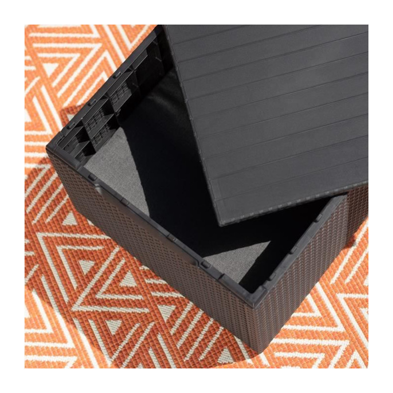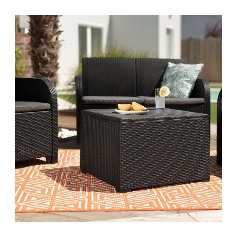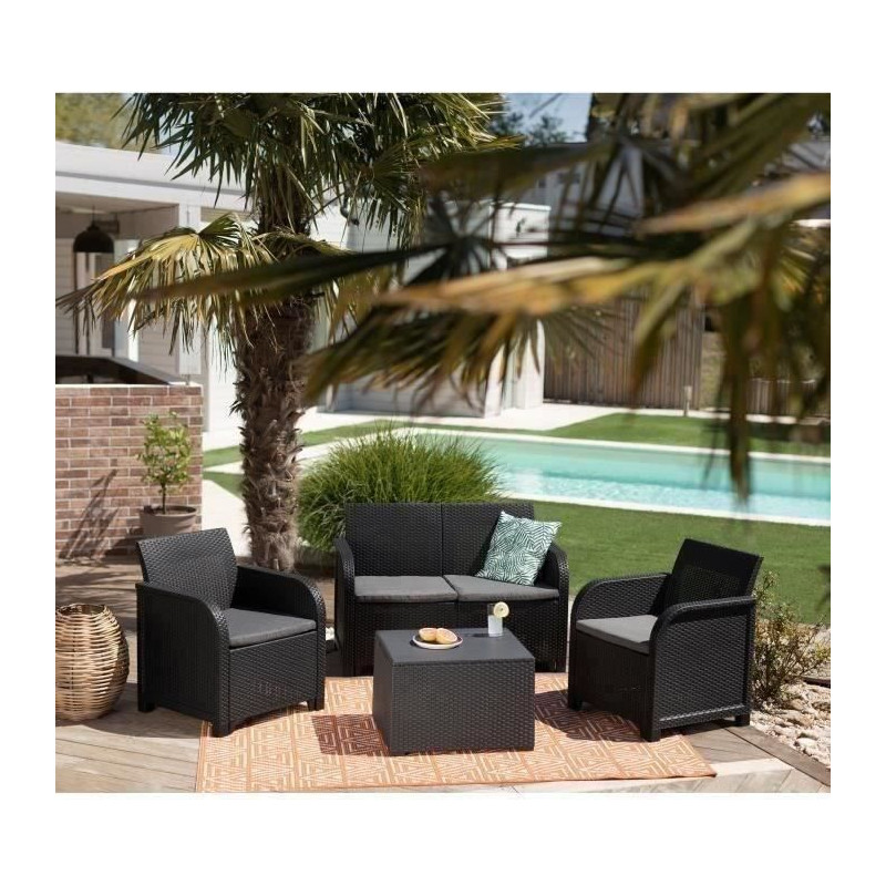 Cet agréable salon de jardin de couleur gris foncé, en résine injectée, se compose d'une agréable banquette de deux places, de deux fauteuils et d'une table basse avec coffre range-coussins. Ce produit est vendu avec des coussins et dispose de dossiers ergonomiques, ce qui le rendra confortable. Il est a monter soi-meme.