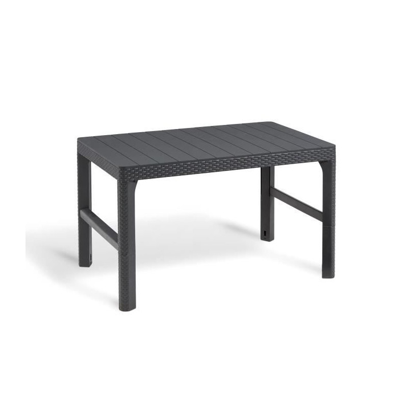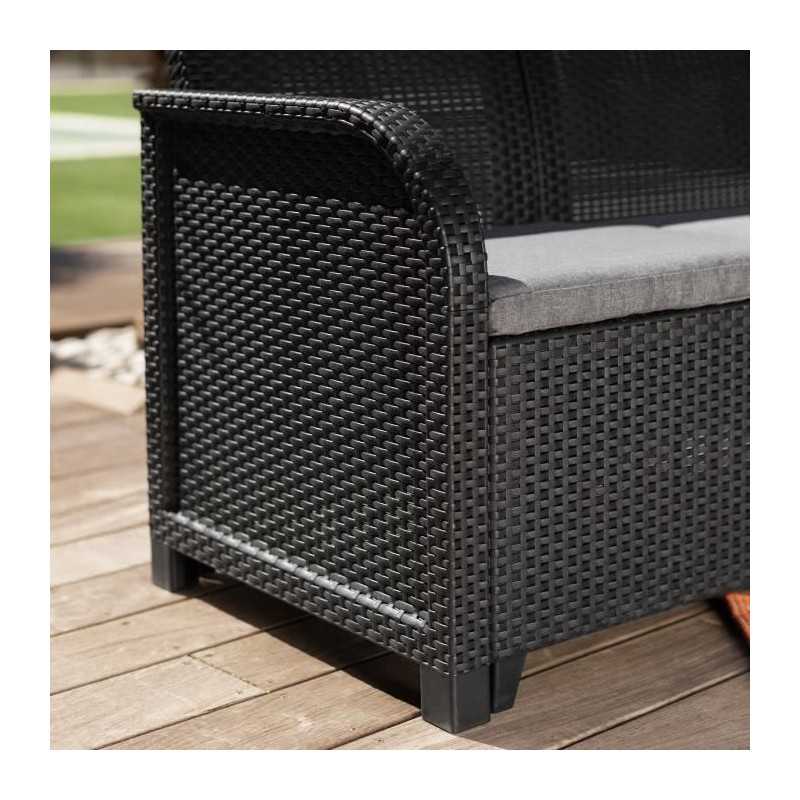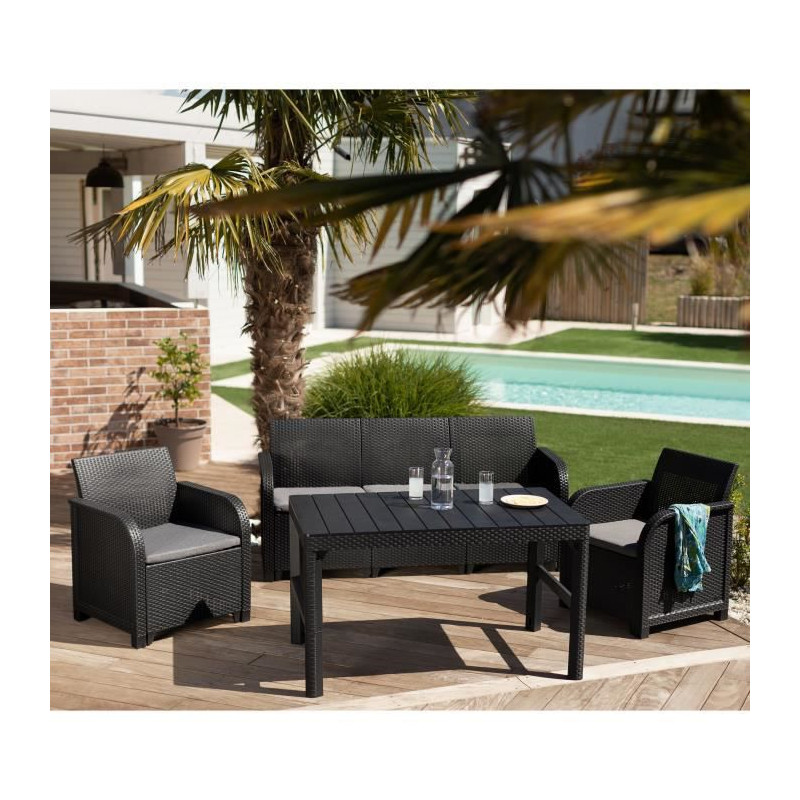 Cet agréable salon de jardin de couleur gris foncé se compose d'une banquette 3 places, de deux fauteuils et d'une table 2 positions (Up & Down). Ce produit est vendu avec des coussins et dispose de dossiers ergonomiques ce qui le rendra confortable. Il est a monter soi-meme. Possibilité d'assembler en 2 canapé d'angle.