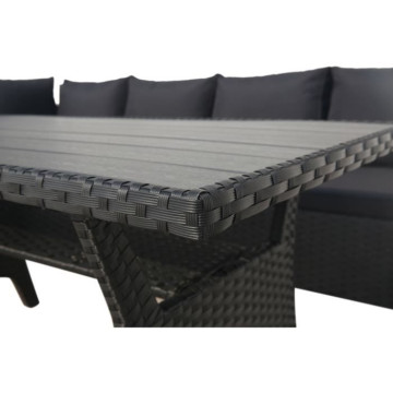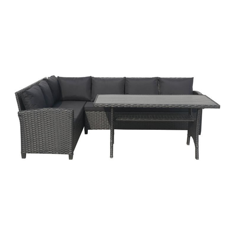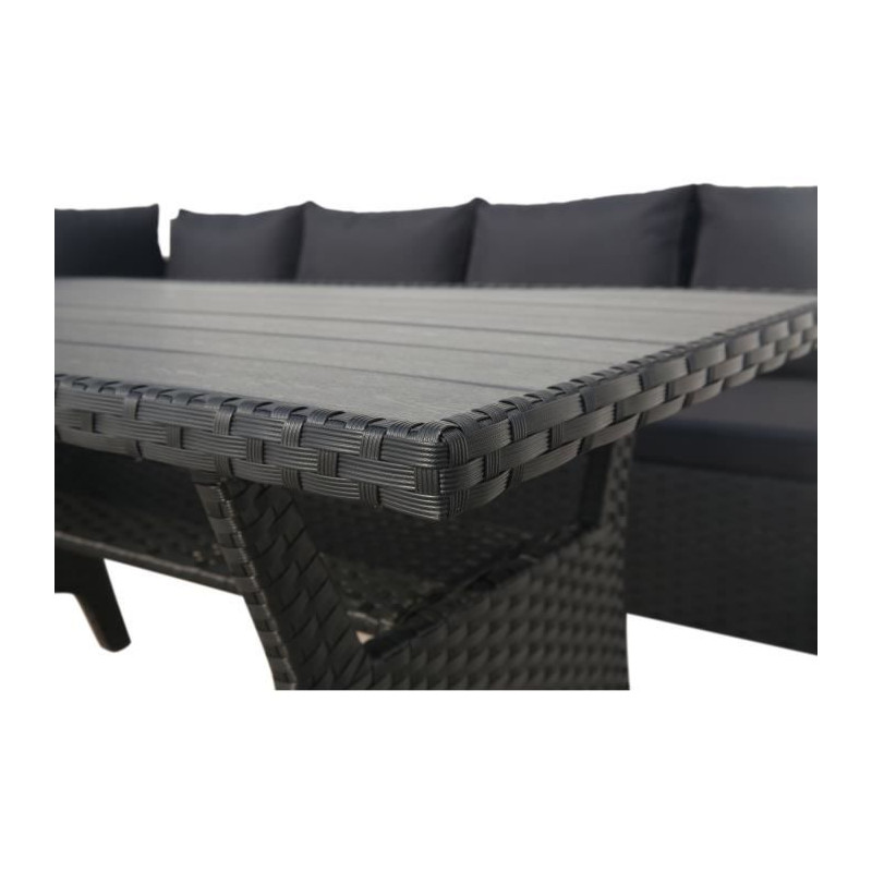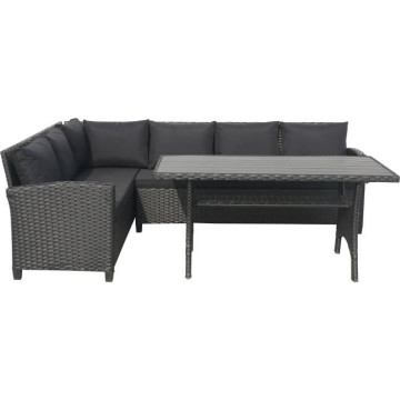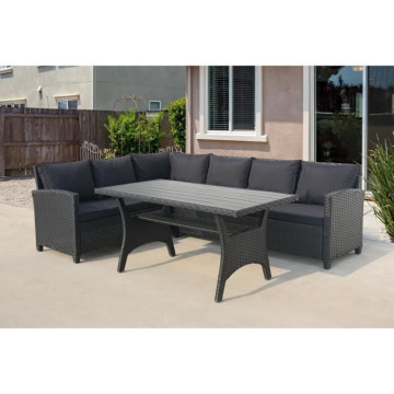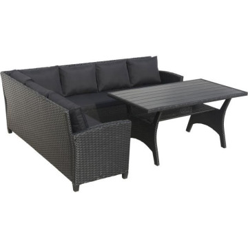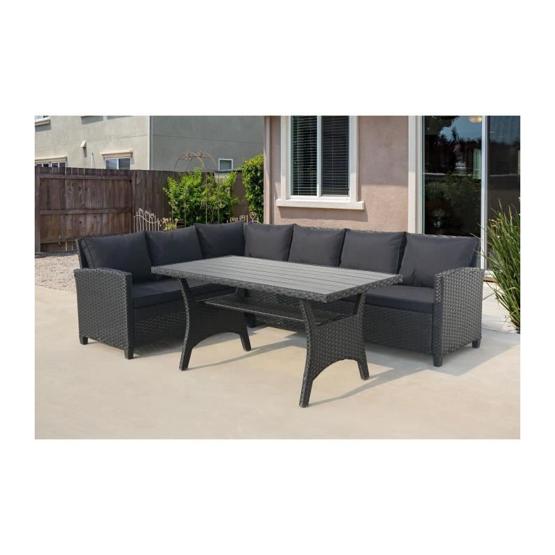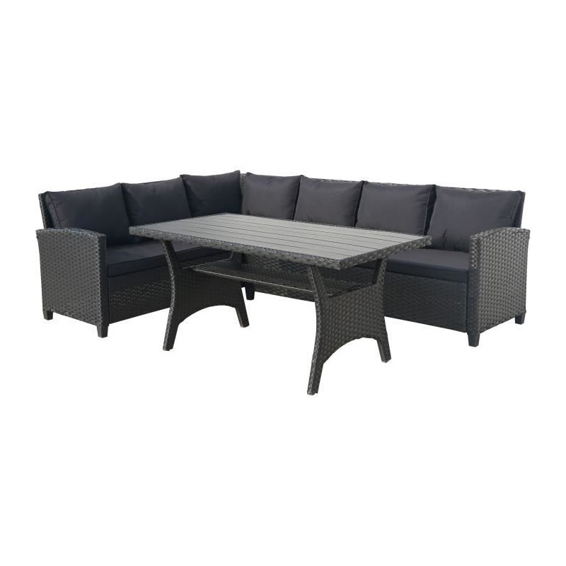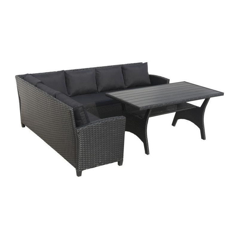 Ce salon de jardin s'integrera parfaitement a votre terrasse, dans un style design et contemporain. Le canapé d'angle, tres confortable grâce a ses coussins, vous permettra de profiter de la convivialité de vos repas en extérieur, en famille ou entre amis. Sa structure imitation rotin tressé et son plateau en verre le rendent solide et facile d'entretien.
