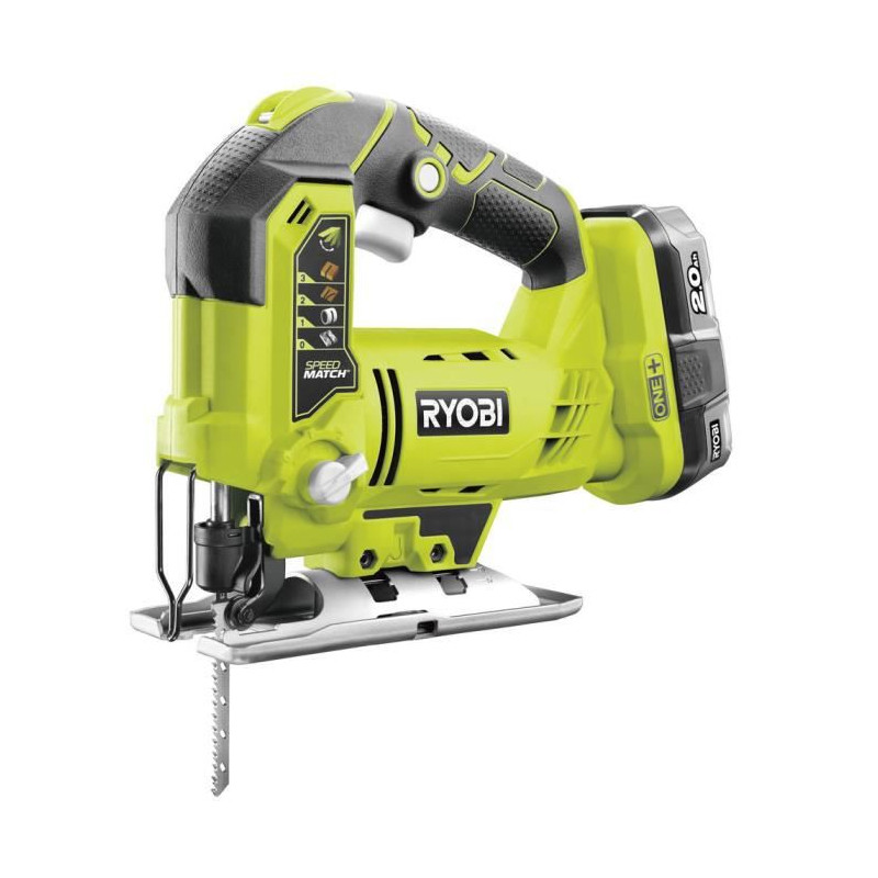 RYOBI One+ Scie sauteuse pendulaire sans fil 18V - R18RJ-120S - vitesses 1100-3000 cp/min, course 25mm, capacite de coupe : bois 101mm/ metal 6mm, inclinaison 0-45? - 1 batterie de 2 Ah - 1 sac de rangement