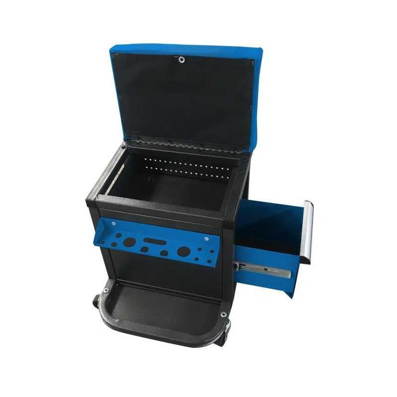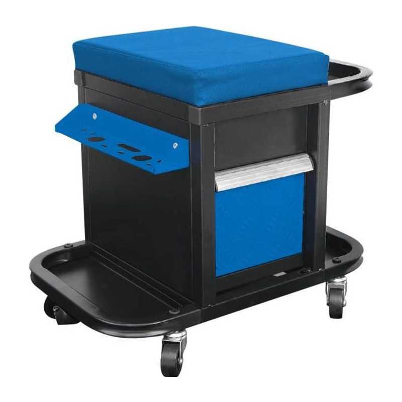 1 soute de rangement - Panneau perforé latéral - 4 roues pivotantes - fauteuil lessivable - Siege confortable toile antitache, rembourré sur soute de rangement - Grand tiroir de rangement sur le côté - Support latéral perforé pour le rangement des tournevis - Supportant au total 100 kgs outils inclus - Dimensions : 50x36x45 cm.