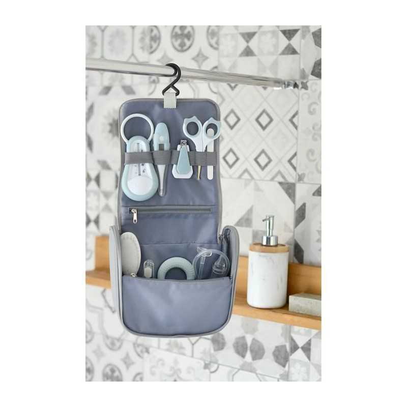TROUSSE DE TOILETTE : 9 accessoires indispensables pour la toilette et les soins de bébé : thermometre de bain, thermometre digital, ciseaux, coupe-ongles, brosse a cheveux, anneau de dentition, masseur de gencives, mouche bébé manuel, lime a ongles.