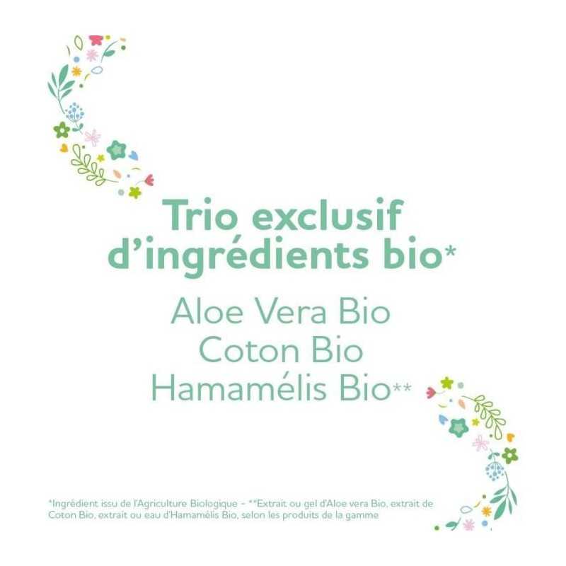 Creme Lavante 3 en 1 visage, corps et cheveux - 96% d'ingrédients d'origine naturelle Composée d'un trio exclusif d'ingrédients BIO* (Extrait d'Aloe vera BIO*, Extrait de Coton BIO* et Eau d'Hamamélis BIO*), cette Creme Lavante sans savon, nourrissante, contenant du miel de lavande et de l'extrait de calendula, est spécialement conçue pour la toilette quotidienne des bébés. Onctueuse et agréablement parfumée, elle n