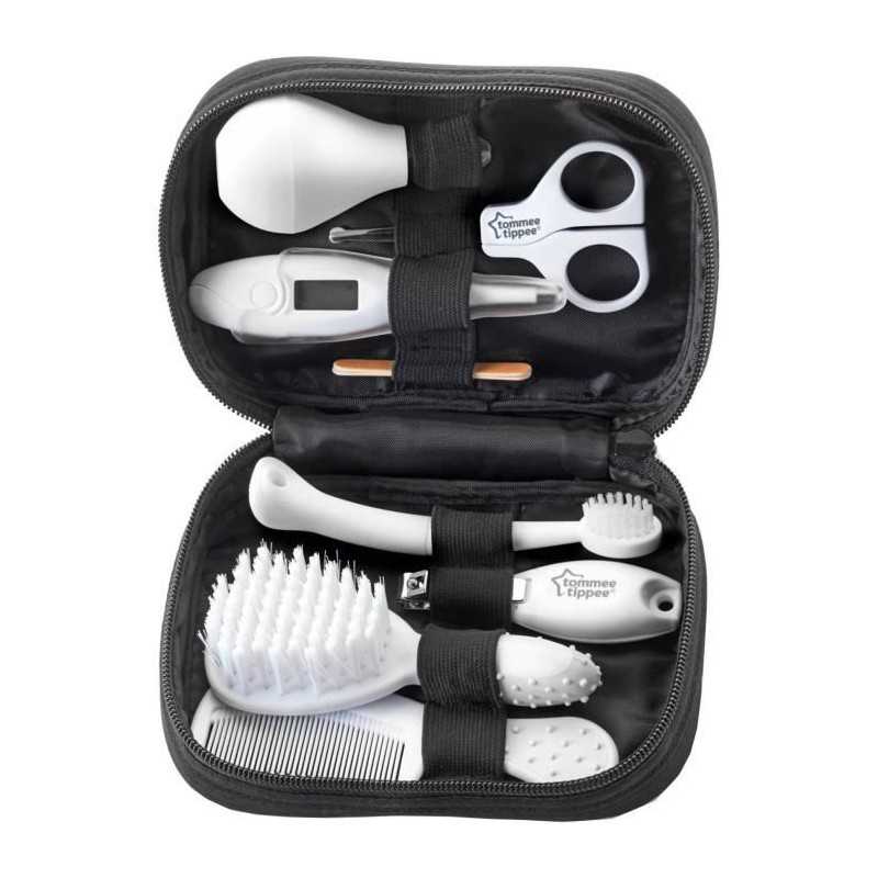- Neuf articles essentiels pour bébé regroupés dans une trousse pratique - Le kit contient 1 x thermometre oral numérique*, 1 x brosse, 1 x peigne, 1 x paire de ciseaux, 1 x coupe-ongles, 2 x limes a ongles, 1 x brosse a dents, 1 x aspirateur nasal - Idéal a la maison tout comme en déplacement - Kit multi-fonctions avec un contenu de grande qualité - Le cadeau idéal pour les jeunes mamans.