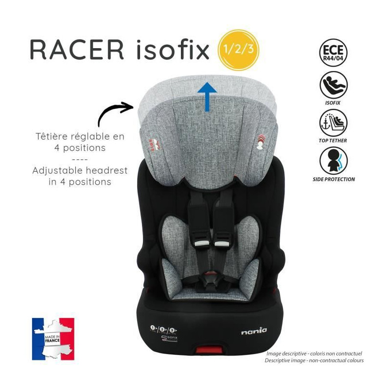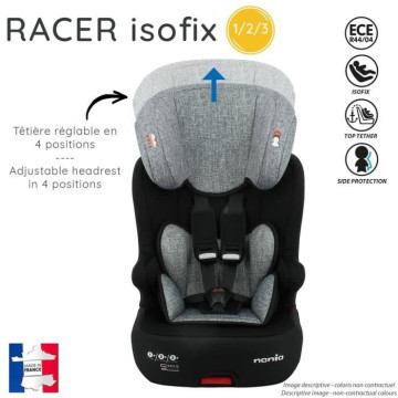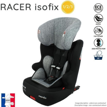Siege auto RACER isofix groupe 1/2/3 pour les enfants de 9 a 36 Kg. Le siege se positionne uniquement face a la route et se fixe avec les ancrages isofix. L'enfant est maintenu avec le harnais de 9 a 18kg, puis vous pouvez utiliser la ceinture de sécurité de 15 a 36kg. La tetiere est réglable en hauteur, et le siege est équipé d'un harnais avec boucle sonore qui vous alerte si l'enfant se détache.