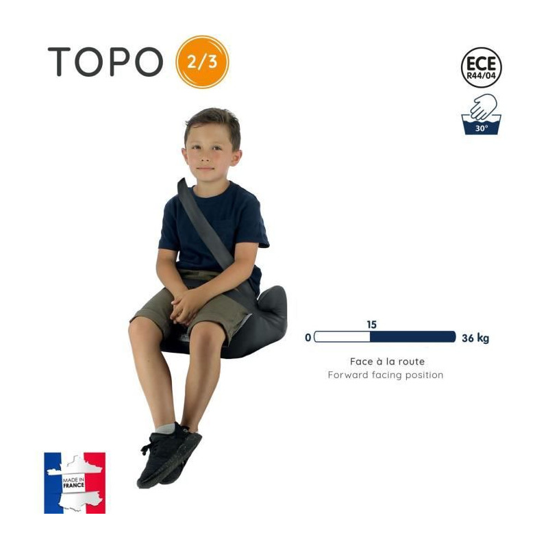 Siege auto rehausseur bas TOPO est un groupe 2/3 pour les enfants de 15 a 36Kg, fabriqué et testé en France. Le siege s'installe a l'arriere du véhicule, l'enfant s'attache avec la ceinture de sécurité 3 points.