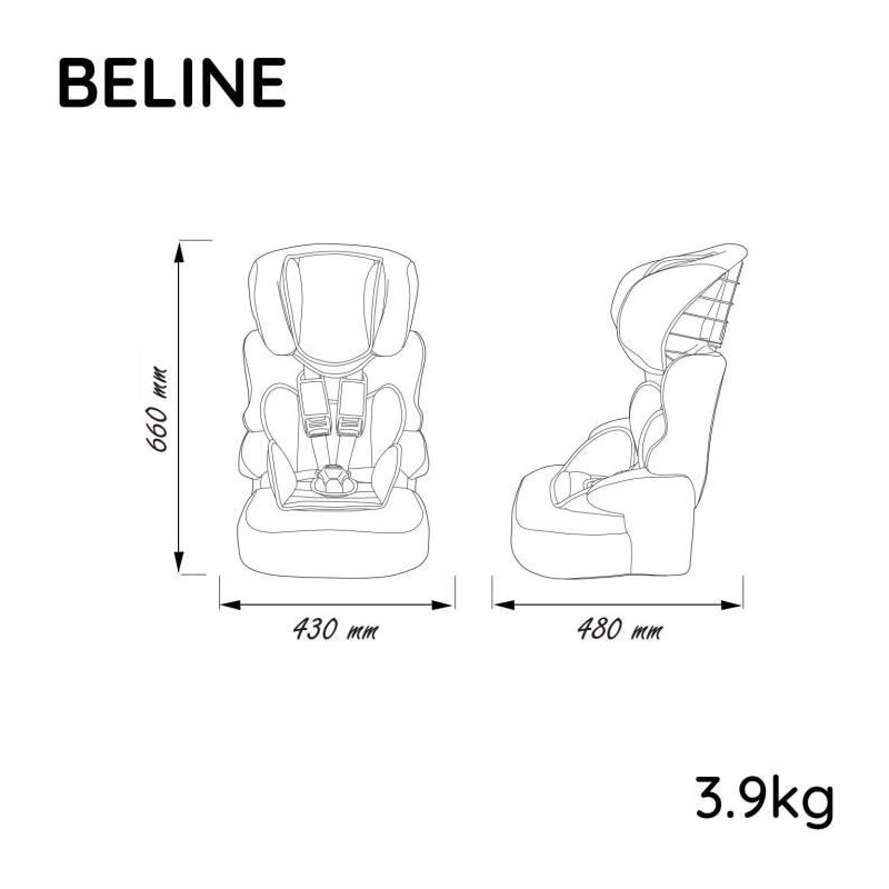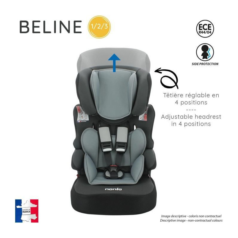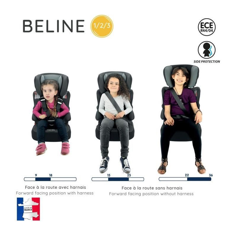 Siege auto BELINE groupe 1/2/3 (9-36kg), fabriqué et testé en FRANCE et qui assure une bonne protection latérale en cas de choc. La tetiere est réglable en hauteur et le siege est équipé d'un harnais utilisable de 9 a 18kg. Le siege auto BELINE s'installe avec la ceinture de sécurité 3 points.