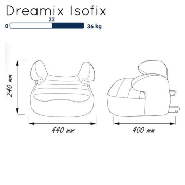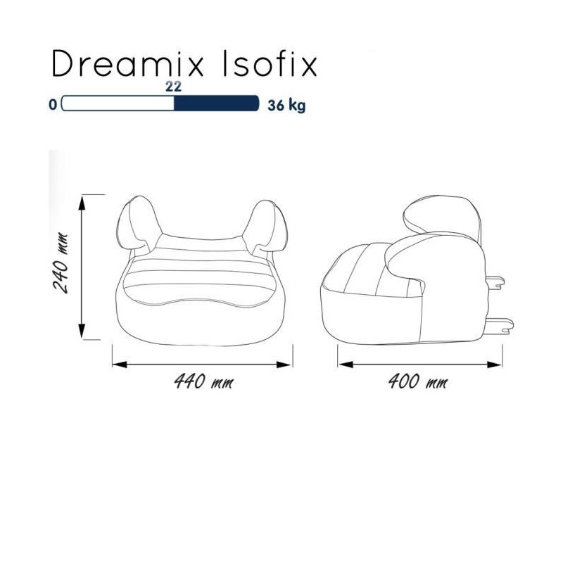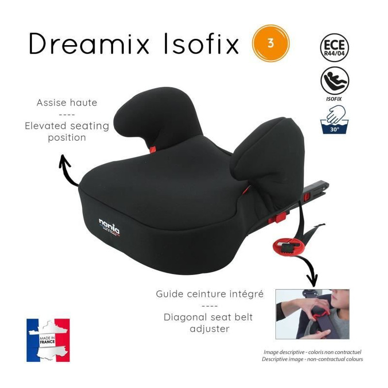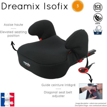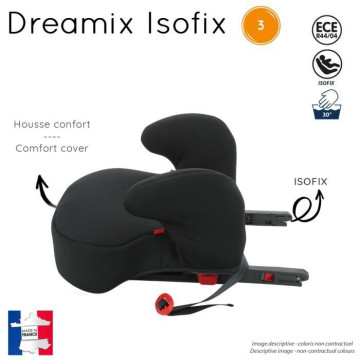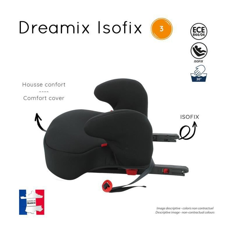 Siege auto rehausseur bas DREAM EASYFIX groupe 3 pour les enfants de 22 a 36kg, fabriqué et testé en France, et homologué ECE R44/04. Le siege s'installe a l'arriere, et se fixe grâce aux ancrages isofix. Il est confortable, et est équipé d'un guide ceinture pour un passage correct de la ceinture sur l'épaule de l'enfant.