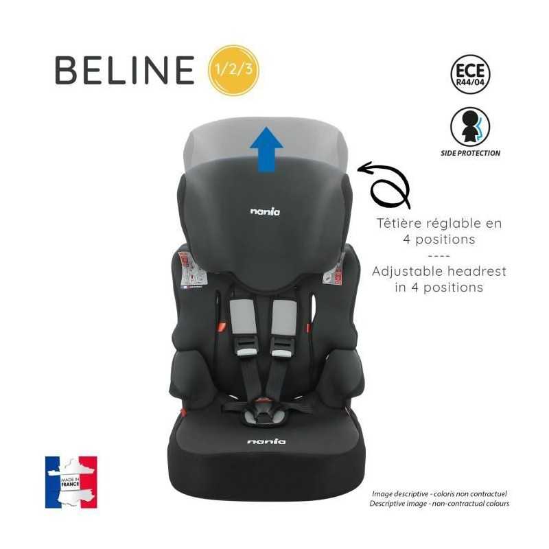 Siege auto BELINE groupe 1/2/3 pour les enfants de 9 a 36kg. Homologué ECE R44/04 et fabriqué et testé en France. Il assure une protection latérale. Il se fixe avec la ceinture de sécurité. Tetiere réglable. Harnais 5 points de 9 a 18kg.