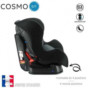Siege auto COSMO groupe 0/1 pour les enfants de la naissance a 18kg. Homologué ECE R44/04 et fabriqué en France. Fixation avec la ceinture de sécurité. Utilisation dos a la route jusqu'a 10kg, puis face route de 9 a 18kg. Protection latérale, coussins réducteurs, assise inclinable en 4 positions.
