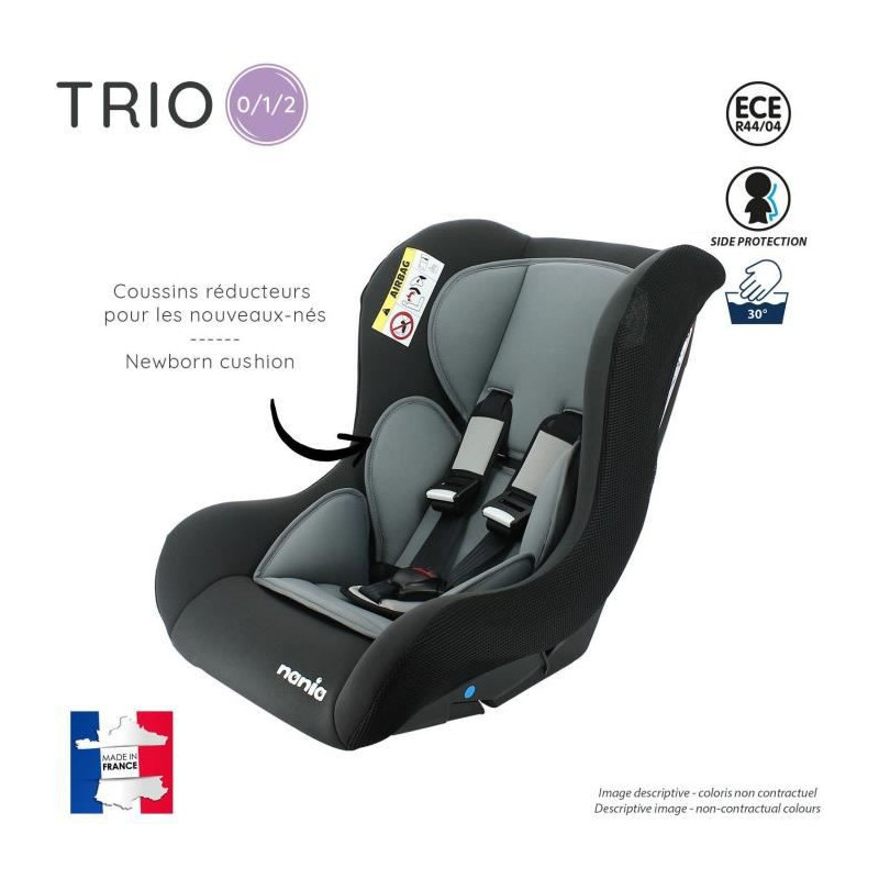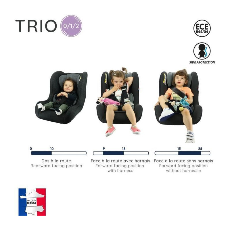 Le siege auto TRIO groupe 0/1/2 est adapté aux enfants de 0 a 25 Kg, il est fabriqué et testé en FRANCE et homologué selon la norme ECE R44/04, Le siege se fixe avec la ceinture et se positionne dos a la route de 0 a 10kg puis face a la route a partir de 9kg jusqu'a 25kg.