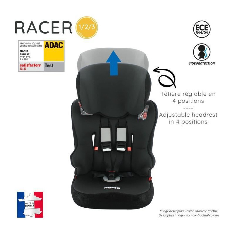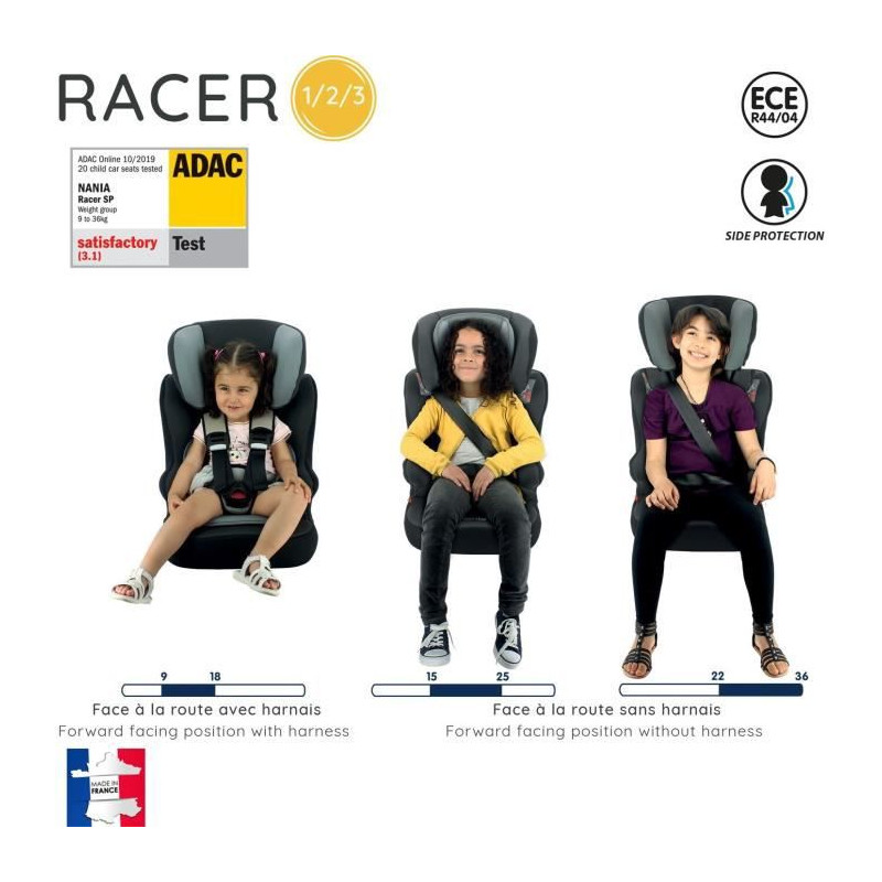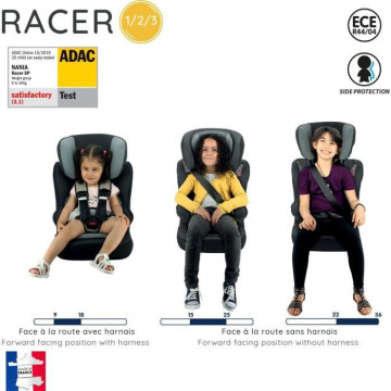 Le siege auto RACER groupe 1/2/3 (9-36kg) fabriqué et testé en France qui convient aux enfants des 3 ans jusqu'a 10 ans. Sécurité optimale et confort assuré. Le siege se positionne uniquement face a la route. Il a été recommandé de 3 étoiles aux tests ADAC/TCS.