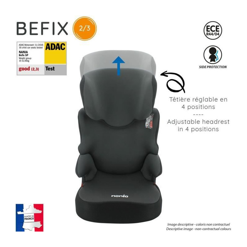Le siege auto BEFIX groupe 2/3 est adapté aux enfants de 15 a 36 Kg. Le siege se positionne uniquement face a la route. Il a été recommandé de 4 étoiles aux tests ADAC/TCS. L'appui-tete est réglable en hauteur, et le siege est muni de protections latérales.