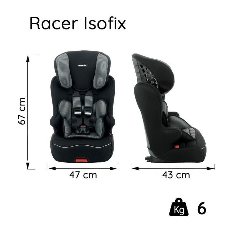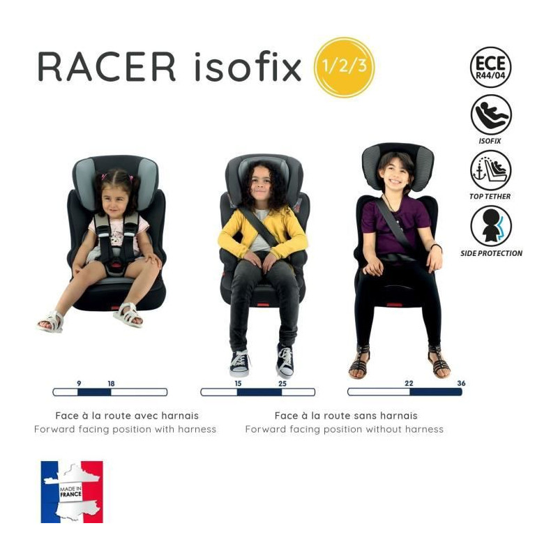 Siege auto RACER isofix groupe 1/2/3 pour les enfants de 9 a 36 Kg. Le siege se positionne uniquement face a la route et se fixe avec les ancrages isofix. L'enfant est maintenu avec le harnais de 9 a 18kg, puis vous pouvez utiliser la ceinture de sécurité de 15 a 36kg. La tetiere est réglable en hauteur, et le siege est équipé d'un harnais avec boucle sonore qui vous alerte si l'enfant se détache.
