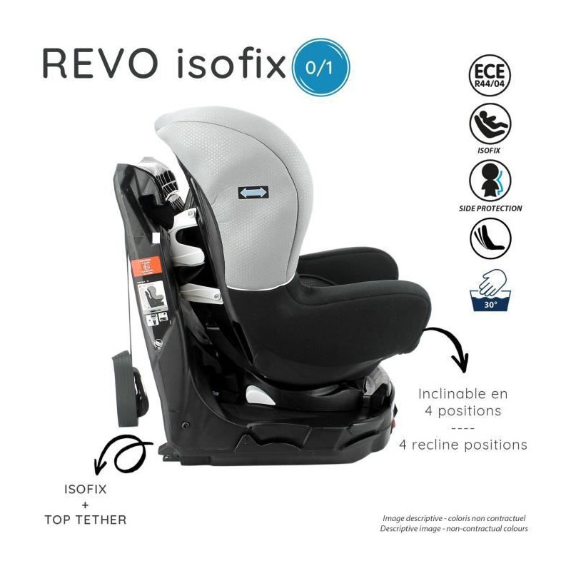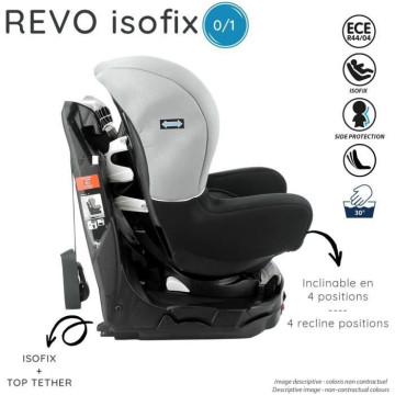 Siege auto isofix 360° groupe 0+/1 qui permet une installation rapide de l'enfant. Le siege REVO se fixe avec les ancrages isofix et se positionne dos a la route de 0 a 13kg. Il assure une bonne protection en cas de choc latéral et offre un grand confort a bébé.
