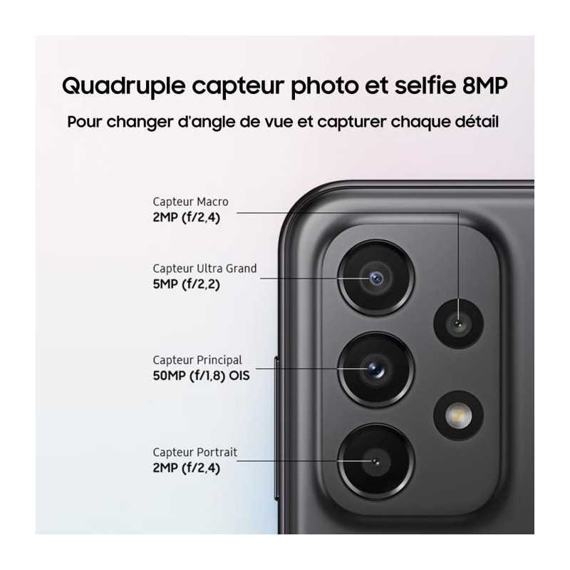 1. Ecran 6,5'' 90Hz Un grand écran panoramique et tres fluide 2. Triple capteur photo et selfie 5MP Pour capturer son sujet sous tous les angles 3. Capteur principal 50MP Des photos riches et détaillées 4. Compatible 5G Une connexion ultra rapide pour profiter de tous vos contenus 5. Batterie 5000 mAh et charge rapide 15W Une batterie longue durée qui peut etre rechargée rapidement