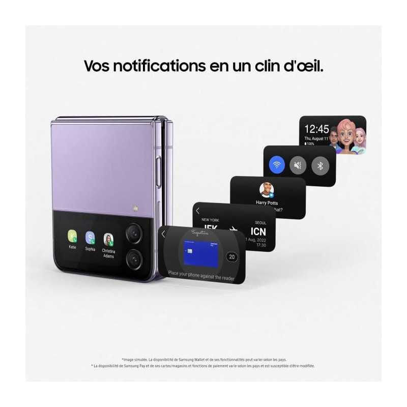 Découvrez le Galaxy Z Flip4, notre Galaxy Z Flip le plus avancé a ce jour. Avec son design iconique, il embarque un écran pliable de 6.7 pouces. Une fois replié, c'est un véritable bijou de technologie qui se glisse facilement dans votre sac ou dans votre poche. Côté photo et vidéo, son double capteur de 12MP sublime vos clichés et vos enregistrements en basse lumiere, tandis que la FlexCam permet la prise de selfies sous tous les angles. Le Flex Mode apporte de nouvelles expériences d'enregistrements et d'appels vidéo sans les mains. Enfin, ses performances ne sont pas en reste, puisque sa puce gravée en 4nm - combinée a une batterie de 3700mAh - assurent une fluidité optimale et une autonomie longue durée.