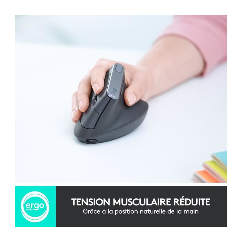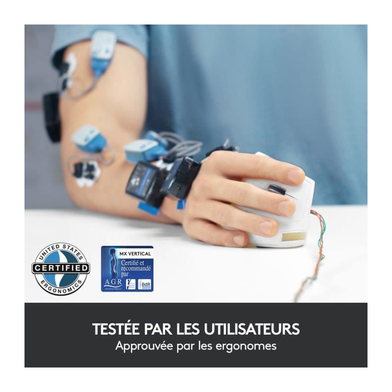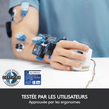 La souris verticale MX est une souris ergonomique avancée qui combine un design né de la science et les performances élevées de la série MX de Logitech. La position naturelle de la main qu'offre la souris verticale MX réduit la pression exercée sur le poignet et l'avant-bras.
