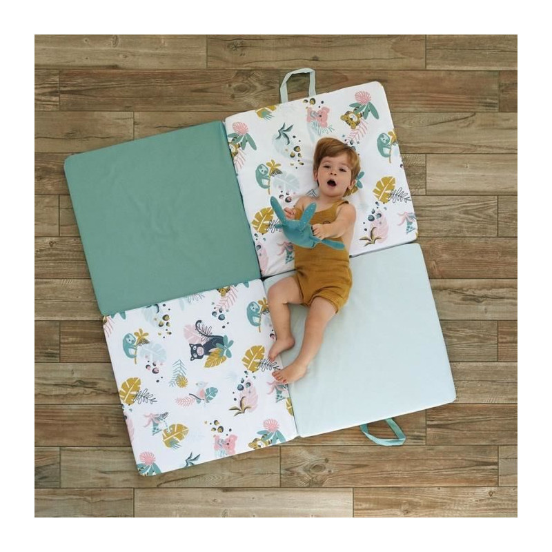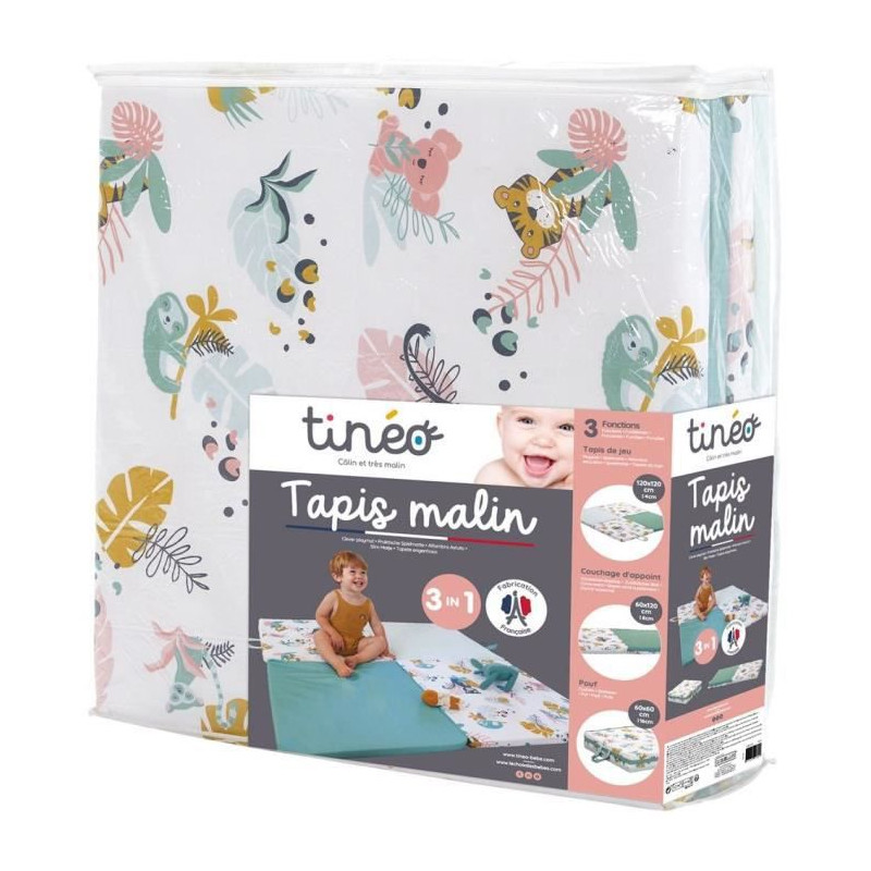 Un tapis d'éveil évolutif multifonction 3en1 1. Non plié, il offre un véritable tapis de jeu (120cm*120cm) 2. Plié en 2, il devient un matelas d'appoint (120cm*60cm*8cm) 3. Plié en 3, il se transforme en pouf pour un siege d'appoint et/ou pour ranger facilement le produit a la fin de la journée.