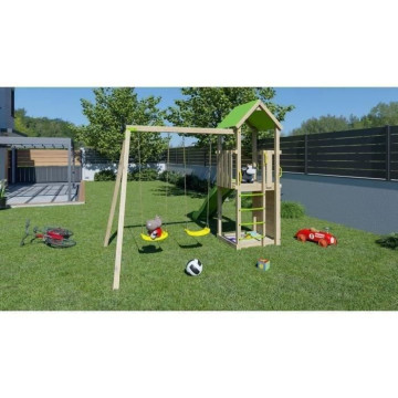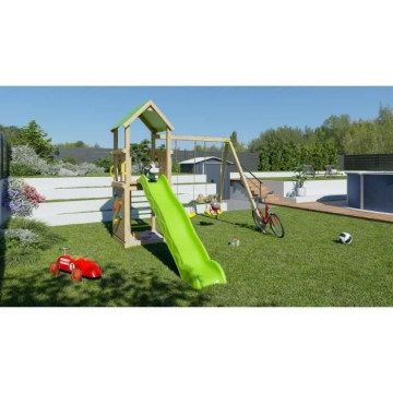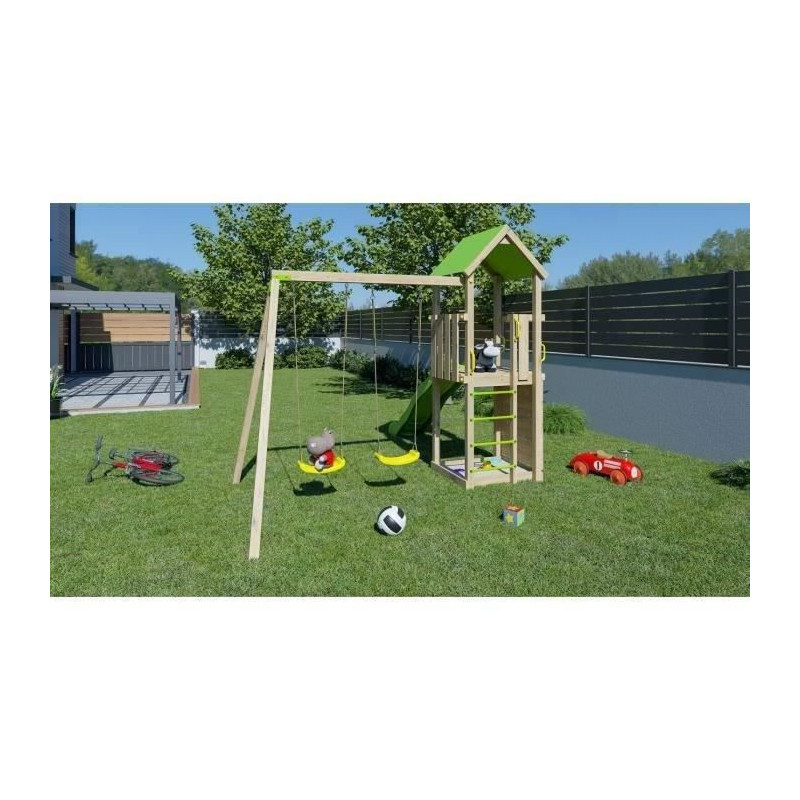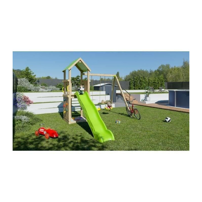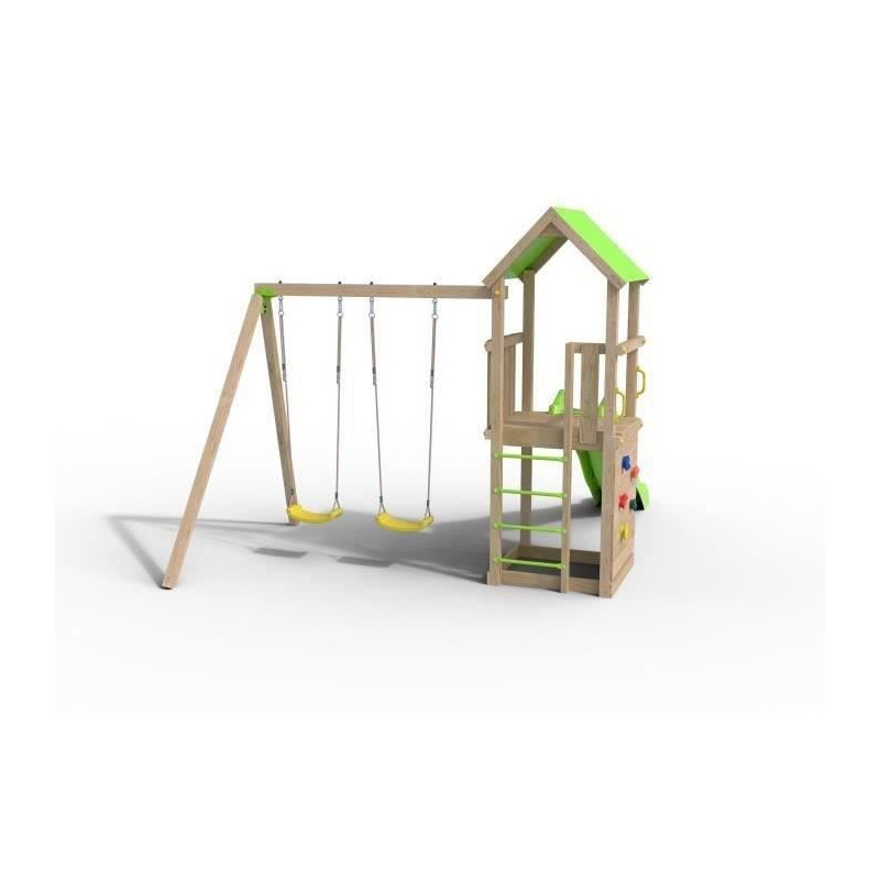 Aire de jeux SMART XPERIENCE, PF 1,20m, bac a sable, mur de grimpe, toboggan 2,63m + extension portique 2,20m, 2 balançoires