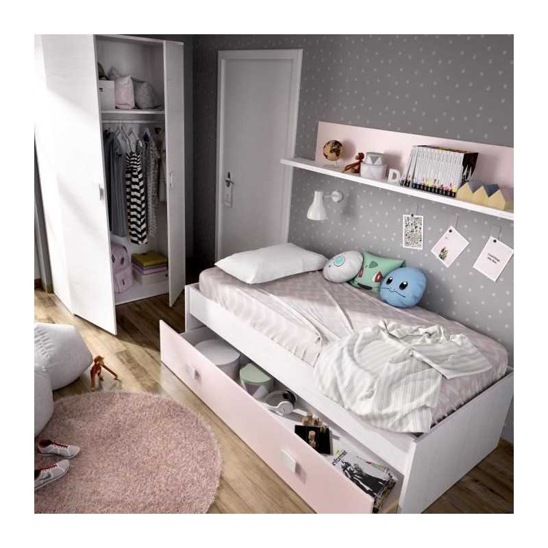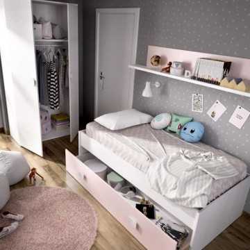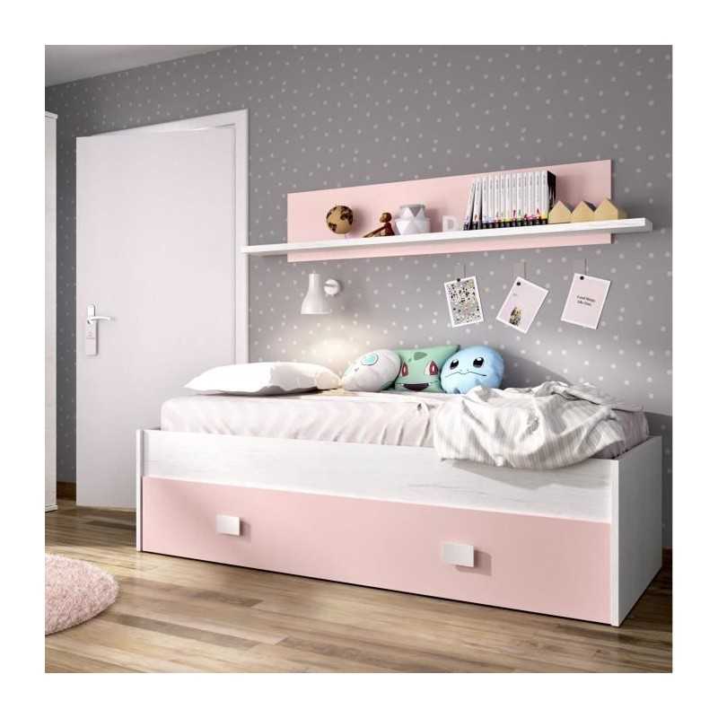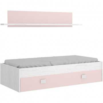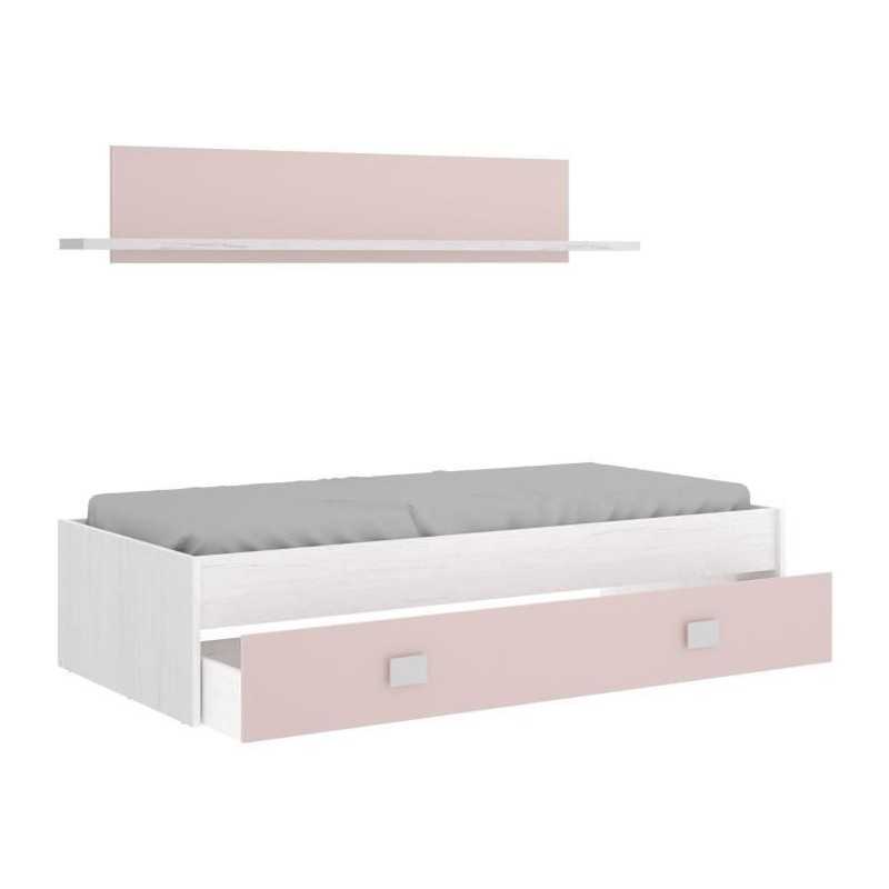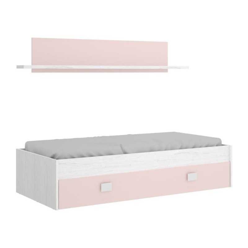 NOA Lit enfant - Décor Chene blanc/rose- 1 Tiroir de rangement + 1 étagere - Structure en panneaux de particules mélaminés - Couchage 90 x 190 cm - Livré sans sommiers, sans matelas - Lit : L 195 x P 97 x H 44 cm - Tiroir : L 189.5 x P 46 x H 25 cm - Étagere : L 185 x P 21 x H 35 cm