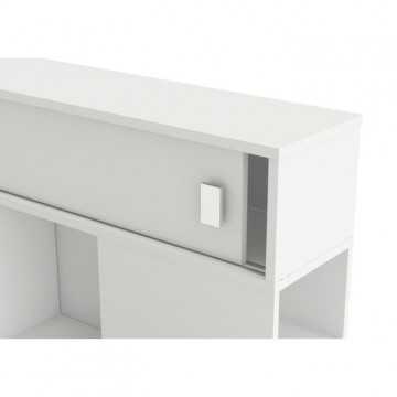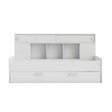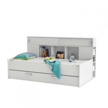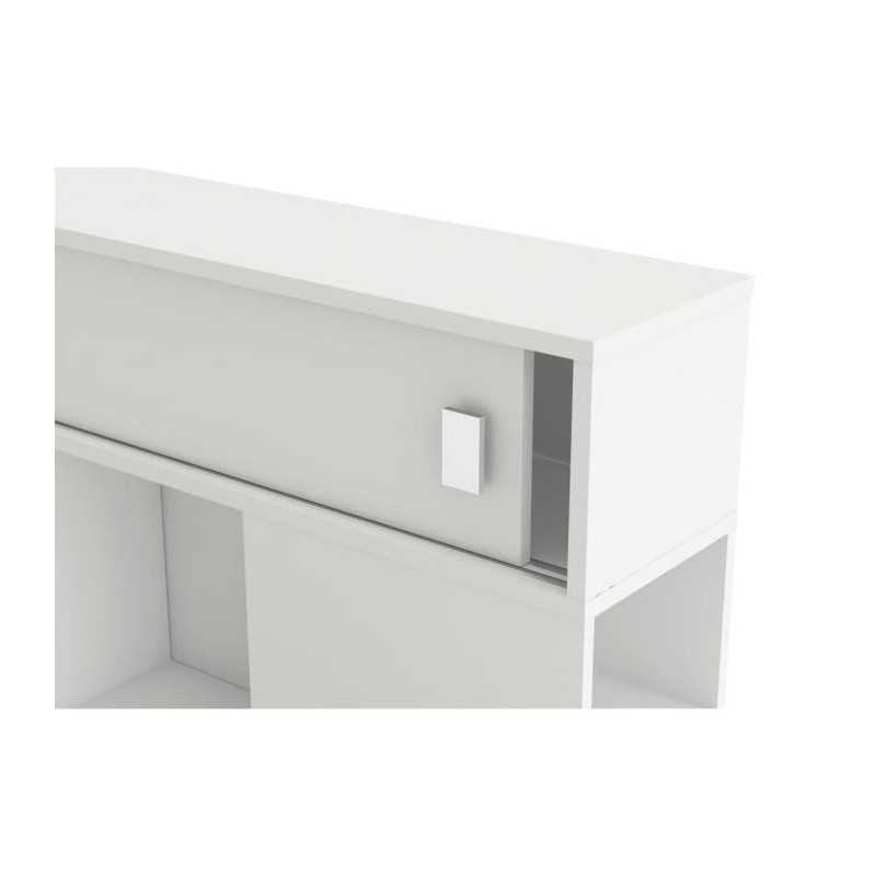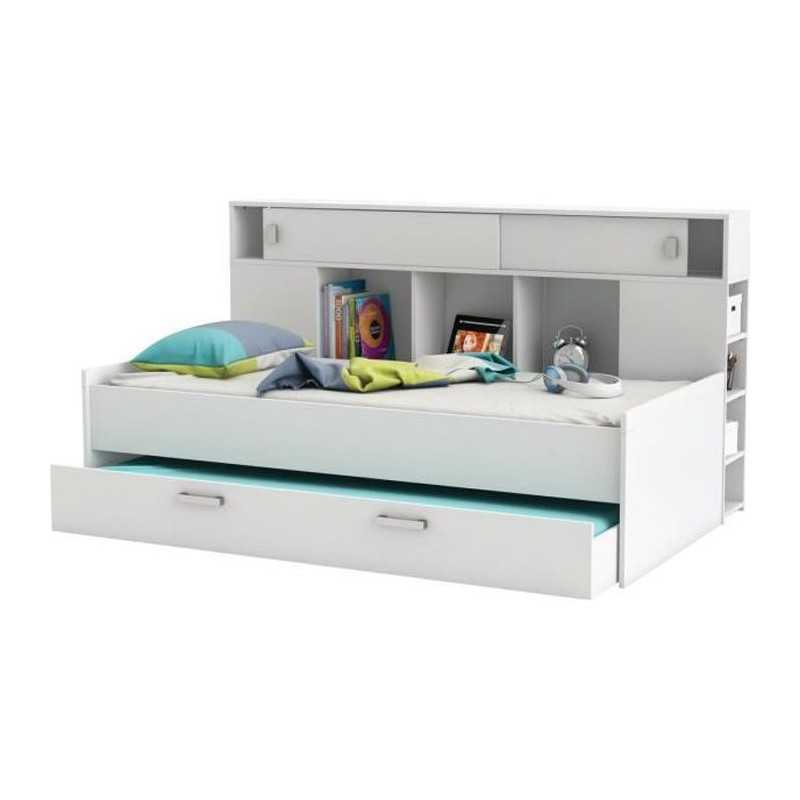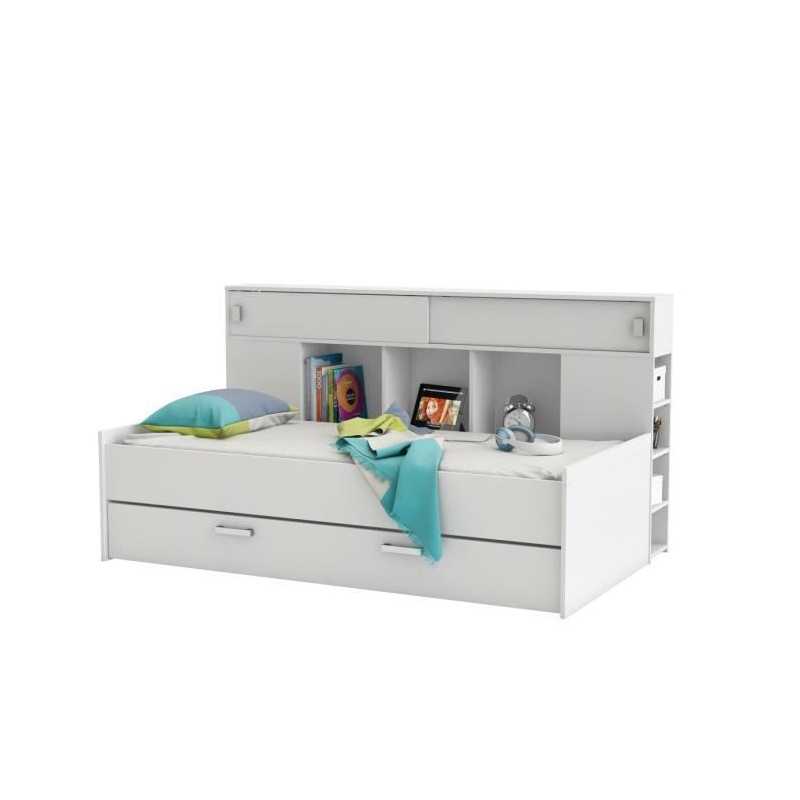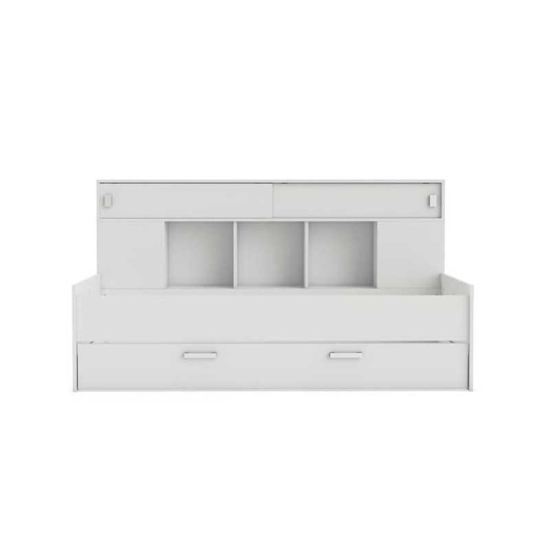 SHERWOOD Lit gigogne enfant mixte l 90 x L 200 cm - Panneaux de particules 15 et 18 mm blanc perle - Style et design contemporain - Tiroir intégré - Tete de lit : 2 portes coulissantes, 3 niches centrales, 4 niches côtés - Ne convient pas aux enfants moins de 6 ans - Fabrication française - Dimensions l120 x L204 x H109 cm.
