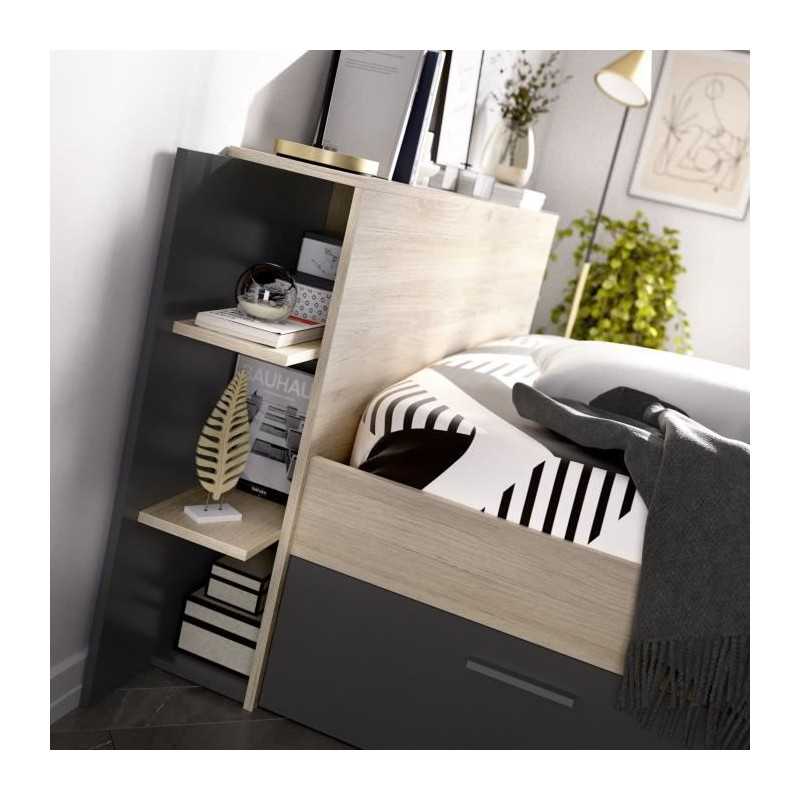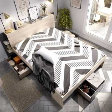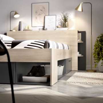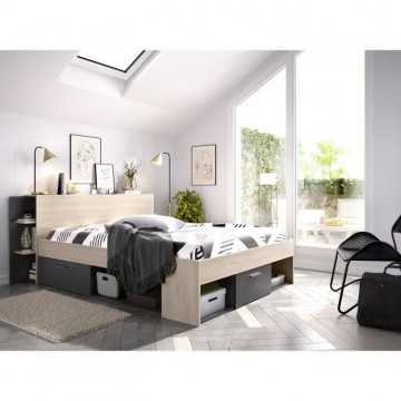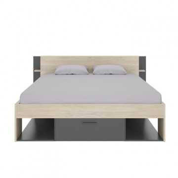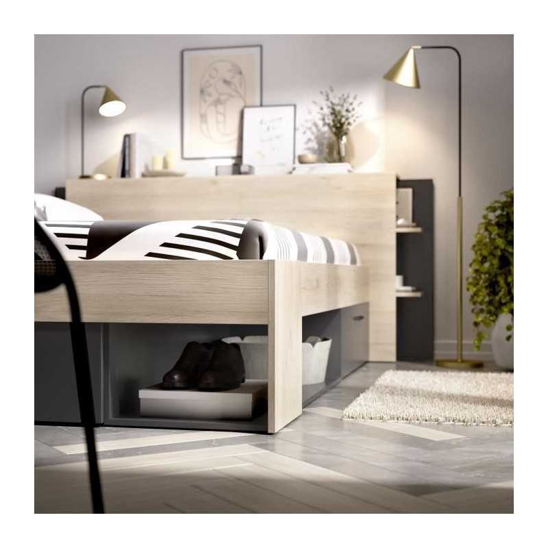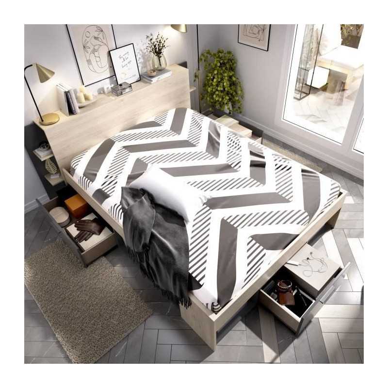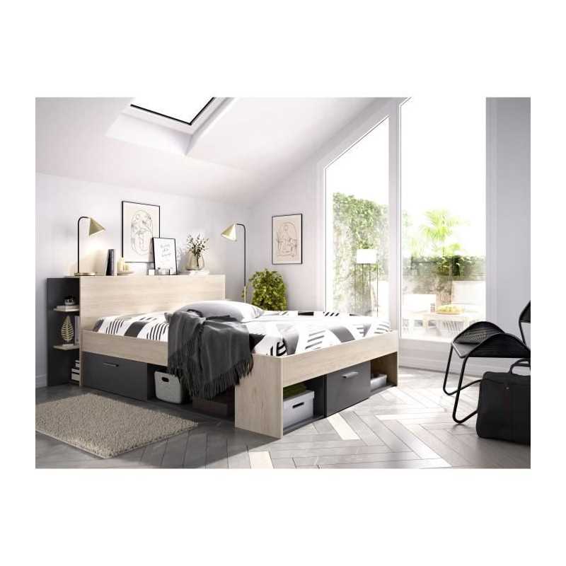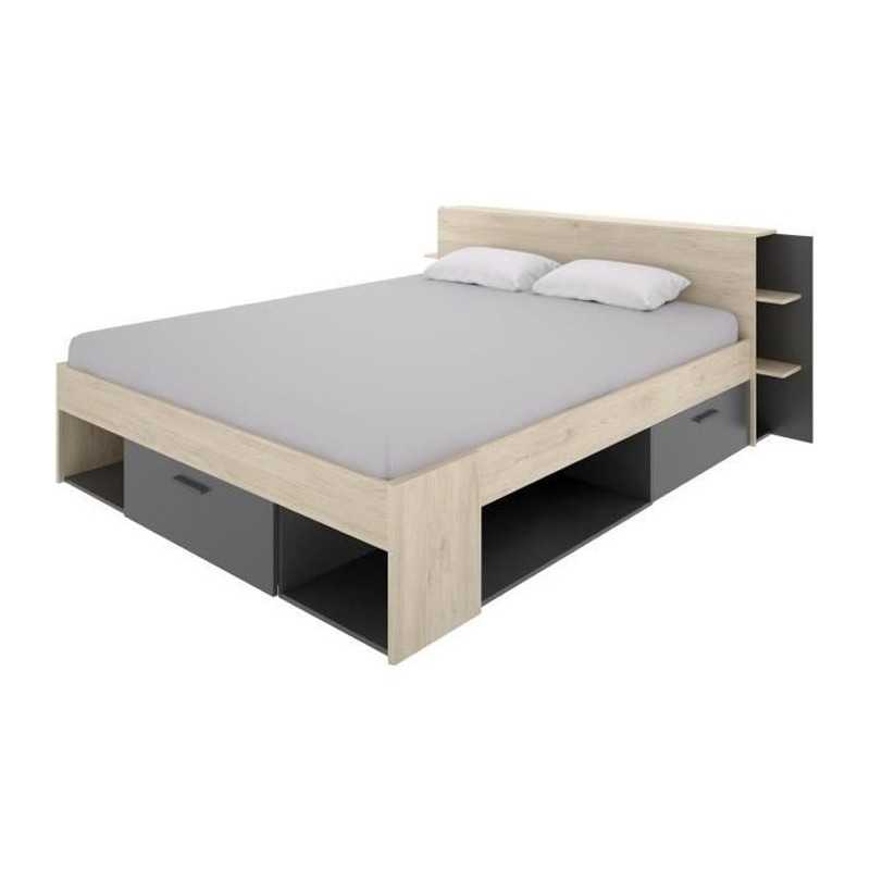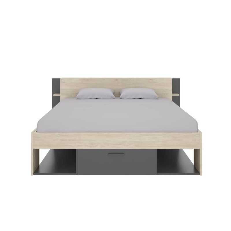 Lit adulte SAX pour couchage 140x190 composé d'une tete de lit avec de multiple rangement, 3 tiroirs et 2 niches sous le lit - Structure en panneaux de particules mélaminés- Coloris : chene et gris anthracite - livré sans sommier ni matelas - Dimensions totales L216 x l 180 x H85 cm ** PRODUIT PLUS RESPONSABLE - BOIS CERTIFIE PEFC ** Le bois contenu dans ce produit est certifié PEFC®. Ce label garantit une gestion