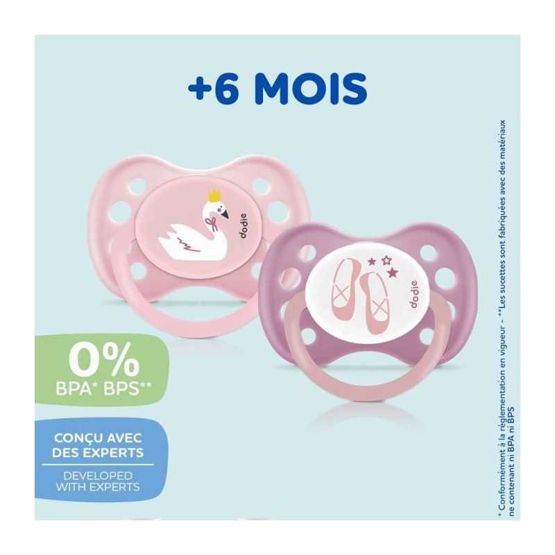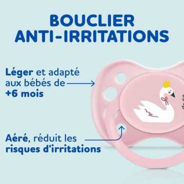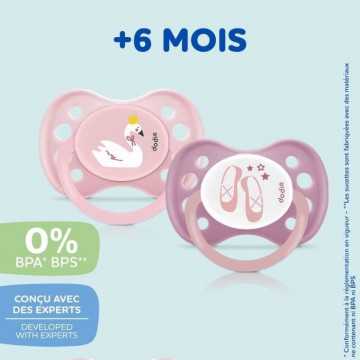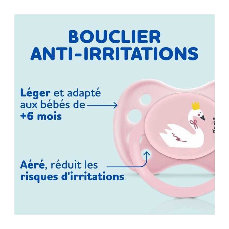 Conçue avec des experts, une téterelle en silicone de forme anatomique, qui garantie une bonne position dans la bouche de bébé. Spécialement conçue pour les bébés de plus de 6 mois pour résister aux premieres dents, elle possede un bouclier aéré en tritan qui réduit les irritations. Lot de 3 sucettes +6 mois