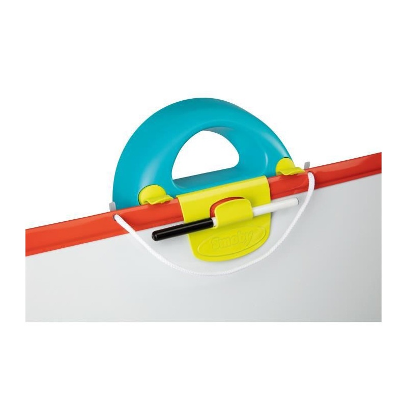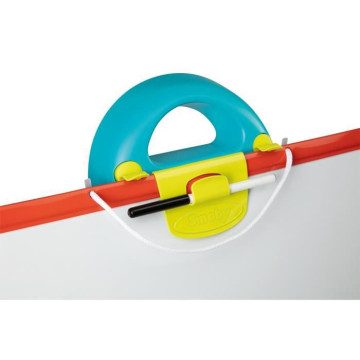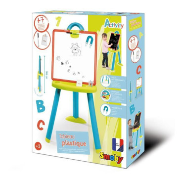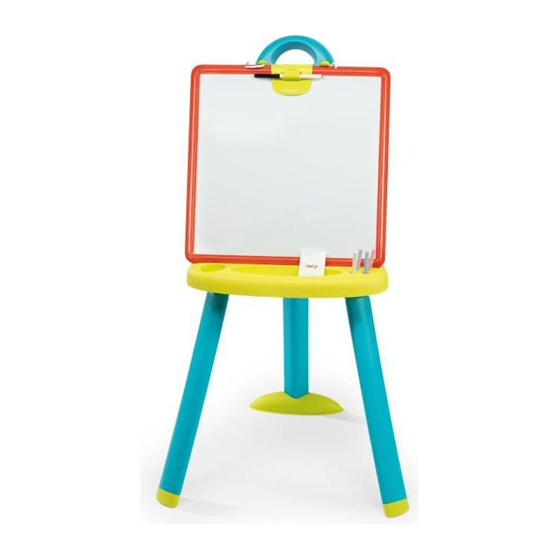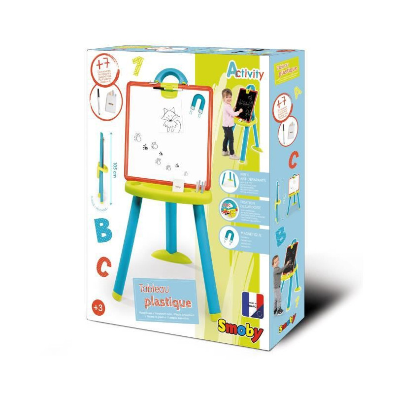 7 accessoires sont fournis : 6 craies et 1 feutre. Légere et résistante aux chocs, l'ardoise double face peut facilement etre retournée et se clipser sur la structure en un seul geste ! Le tableau se plie facilement . Equipé de 3 pieds munis d'embouts antidérapants A partir de 3 ans. Made in France.