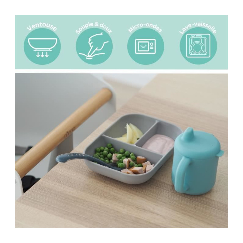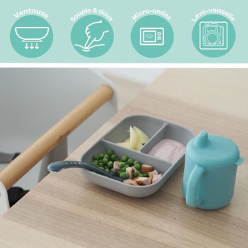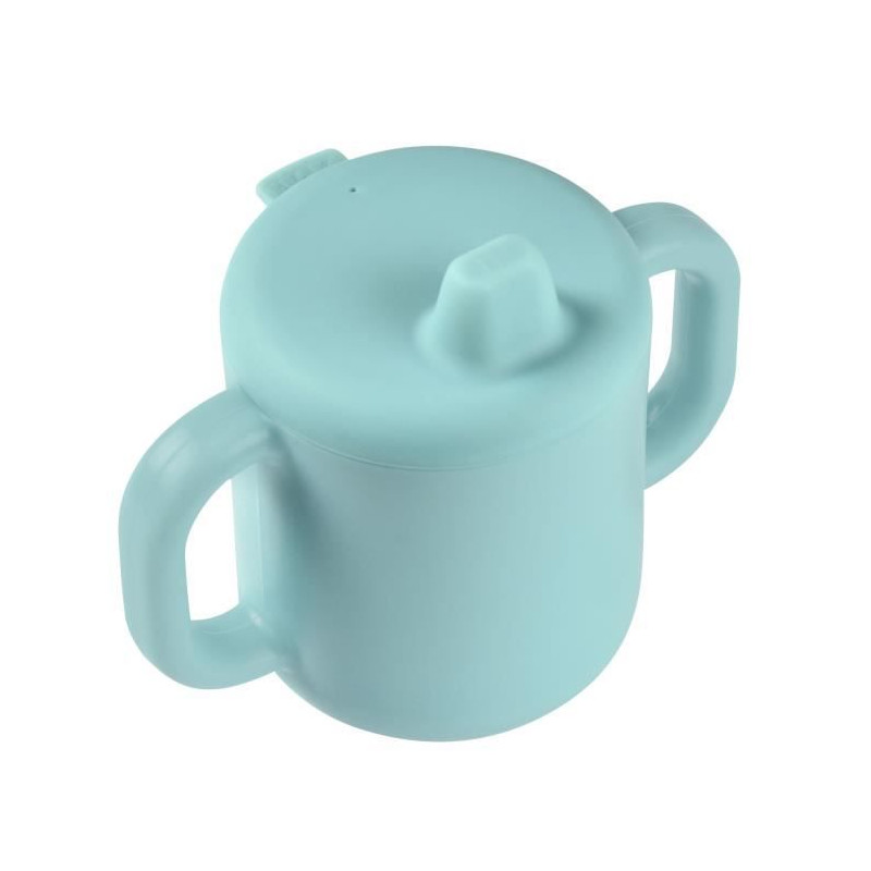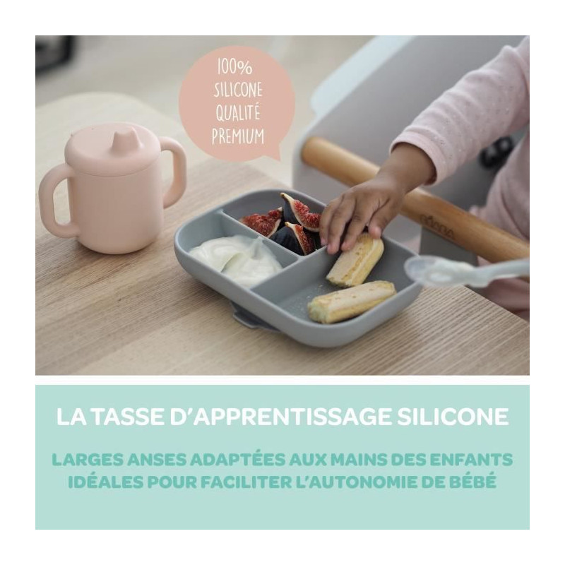 Tasse d'apprentissage en silicone, composée de 2 anses et d'un couvercle bec amovible. Idéale pour favoriser l'autonomie des tout-petits lors des repas.